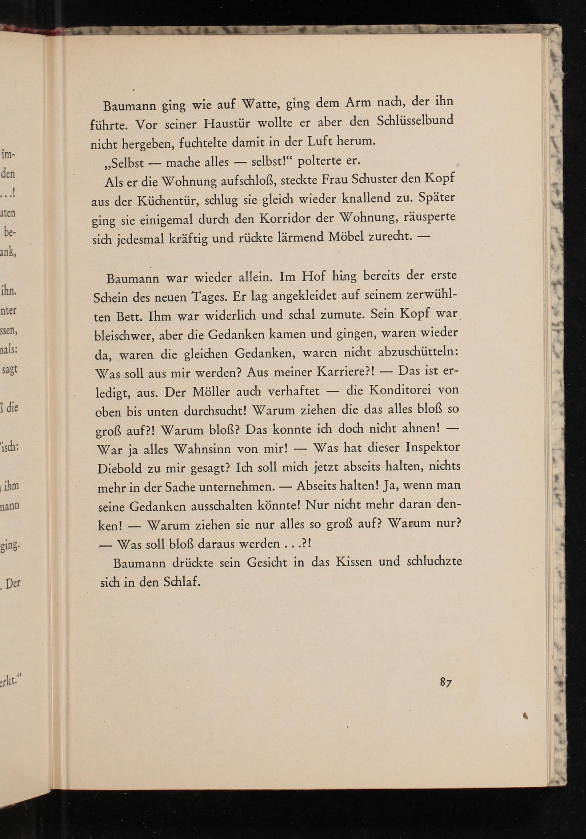 Baumann war wieder allein. Im Hof hing bereits der erste Schein des neuen Tages. Er lag angekleidet auf seinem zerwühlten Bett. Ihm war widerlich und schal zumute. Sein Kopf war bleischwer, aber die Gedanken kamen und gingen, waren wieder da, waren die gleichen Gedanken, waren nicht abzuschütteln: Was soll aus mir werden? Aus meiner Karriere?!- Das ist erledigt, aus. Der Möller auch verhaftet die Konditorei von oben bis unten durchsucht! Warum ziehen die das alles bloß so groß auf?! Warum bloß? Das konnte ich doch nicht ahnen! Was hat dieser Inspektor War ja alles Wahnsinn von mir! Diebold zu mir gesagt? Ich soll mich jetzt abseits halten, nichts mehr in der Sache unternehmen.- Abseits halten! Ja, wenn man seine Gedanken ausschalten könnte! Nur nicht mehr daran denken! Warum ziehen sie nur alles so groß auf? Warum nur? Was soll bloß daraus werden...?!