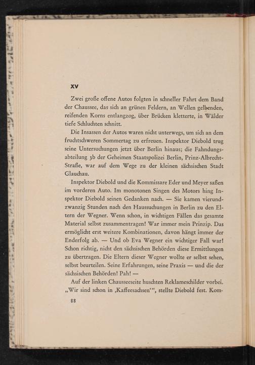 Die Insassen der Autos waren nicht unterwegs, um sich an dem fruchtschweren Sommertag zu erfreuen. Inspektor Diebold trug seine Untersuchungen jetzt über Berlin hinaus; die Fahndungsabteilung 3b der Geheimen Staatspolizei Berlin , Prinz- AlbrechtStraße, war auf dem Wege zu der kleinen sächsischen Stadt Glauchau .