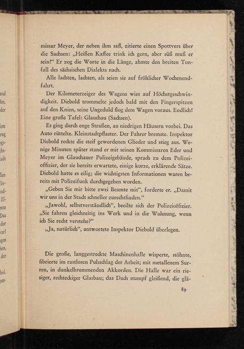 Es ging durch enge Straßen, an niedrigen Häusern vorbei. Das Auto rüttelte. Kleinstadtpflaster. Der Fahrer bremste. Inspektor Diebold reckte die steif gewordenen Glieder und stieg aus. Wenige Minuten später stand er mit seinen Kommissaren Eder und Meyer im Glauchauer Polizeigebäude, sprach zu dem Polizeioffizier, der sie bereits erwartete, einige kurze, erklärende Sätze. Diebold hatte es eilig; die wichtigsten Informationen waren bereits mit Polizeifunk durchgegeben worden.