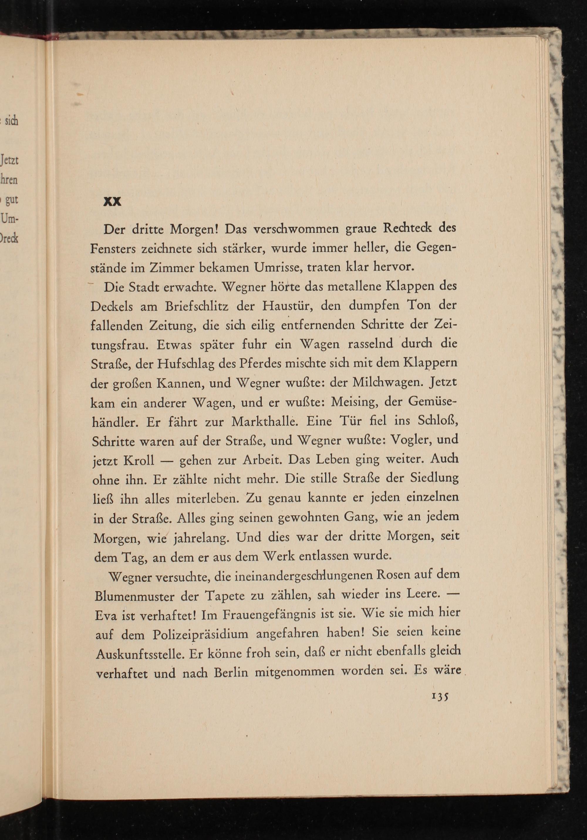 stände im Zimmer bekamen Umrisse, traten klar hervor. = Die Stadt erwachte. Wegner hörte das metallene Klappen des. Deckels am Briefschlitz der Haustür, den dumpfen Ton der fallenden Zeitung, die sich eilig entfernenden Schritte der Zei- tungsfrau. Etwas später fuhr ein Wagen rasselnd durch die Straße, der Hufschlag des Pferdes mischte sich mit dem Klappern der großen Kannen, und Wegner wußte: der Milchwagen. Jetzt kam ein anderer Wagen, und er wußte: Meising, der Gemüse- händler. Er fährt zur Markthalle. Eine Tür fiel ins Schloß, | Schritte waren auf der Straße, und Wegner wußte: Vogler, und | jetzt Kroll— gehen zur Arbeit. Das Leben ging weiter. Auch