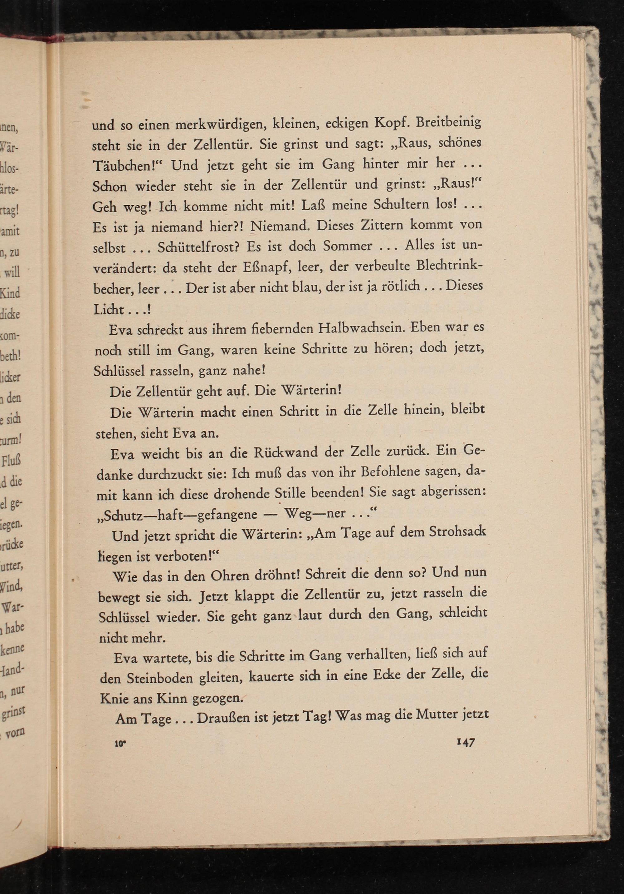 und so einen merkwürdigen, kleinen, eckigen Kopf. Breitbeinig steht sie in der Zellentür. Sie grinst und sagt: ,, Raus, schönes Täubchen!" Und jetzt geht sie im Gang hinter mir her... Schon wieder steht sie in der Zellentür und grinst: ,, Raus!" Geh weg! Ich komme nicht mit! Laß meine Schultern los!... Es ist ja niemand hier?! Niemand. Dieses Zittern kommt von selbst... Schüttelfrost? Es ist doch Sommer... Alles ist unverändert: da steht der Eẞnapf, leer, der verbeulte Blechtrinkbecher, leer... Der ist aber nicht blau, der ist ja rötlich... Dieses