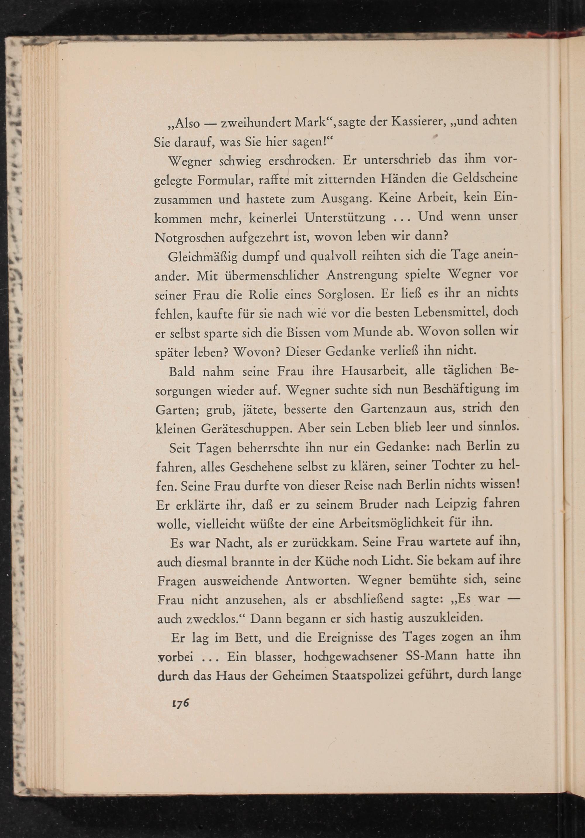 Gleichmäßig dumpf und qualvoll reihten sich die Tage aneinander. Mit übermenschlicher Anstrengung spielte Wegner vor seiner Frau die Rolie eines Sorglosen. Er ließ es ihr an nichts fehlen, kaufte für sie nach wie vor die besten Lebensmittel, doch er selbst sparte sich die Bissen vom Munde ab. Wovon sollen wir später leben? Wovon? Dieser Gedanke verließ ihn nicht.