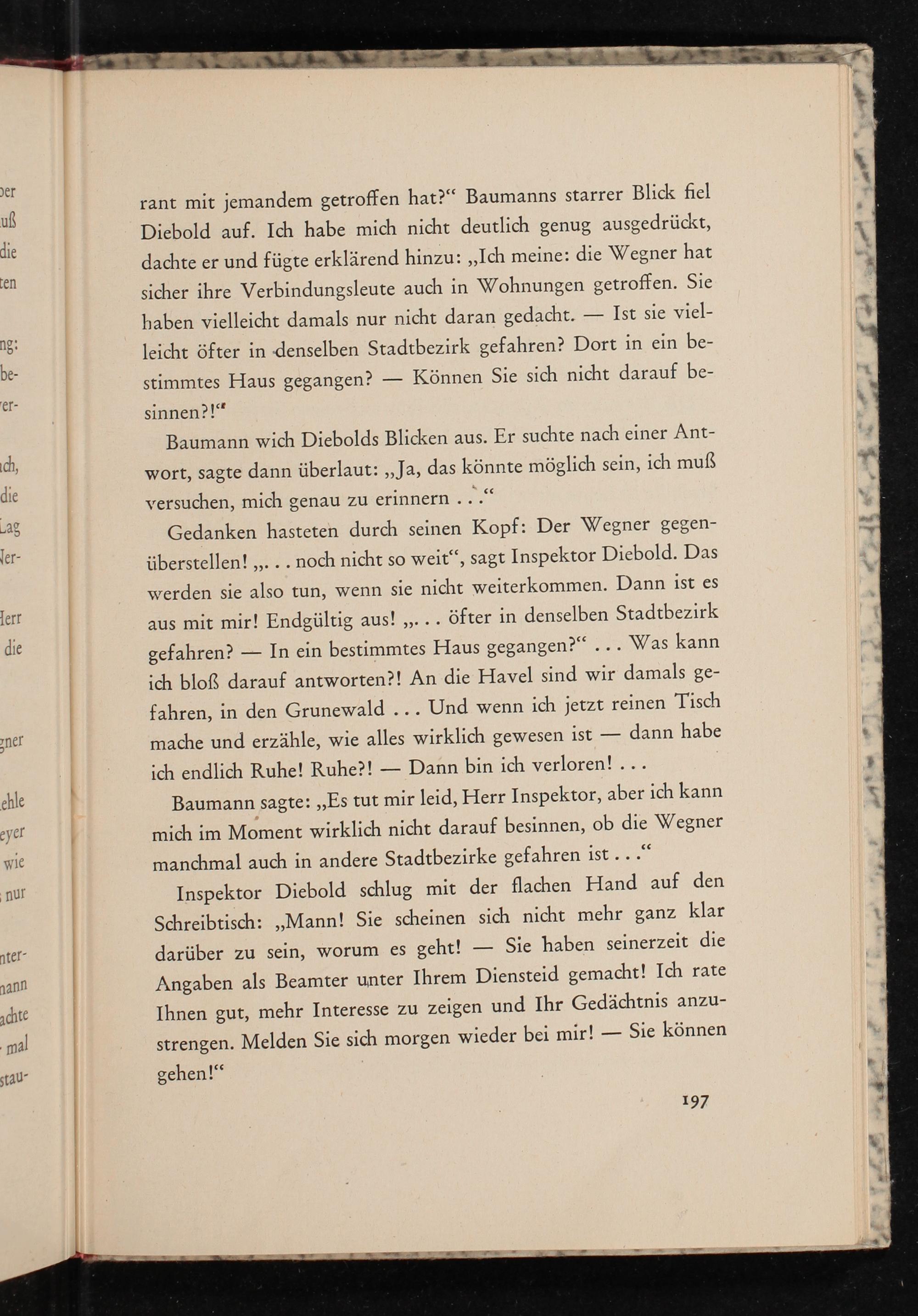 Baumann sagte:„Es tut mir leid, Herr Inspektor, aber ich kann mich im Moment wirklich nicht darauf besinnen, ob die Wegner manchmal auch in andere Stadtbezirke gefahren ist.. n