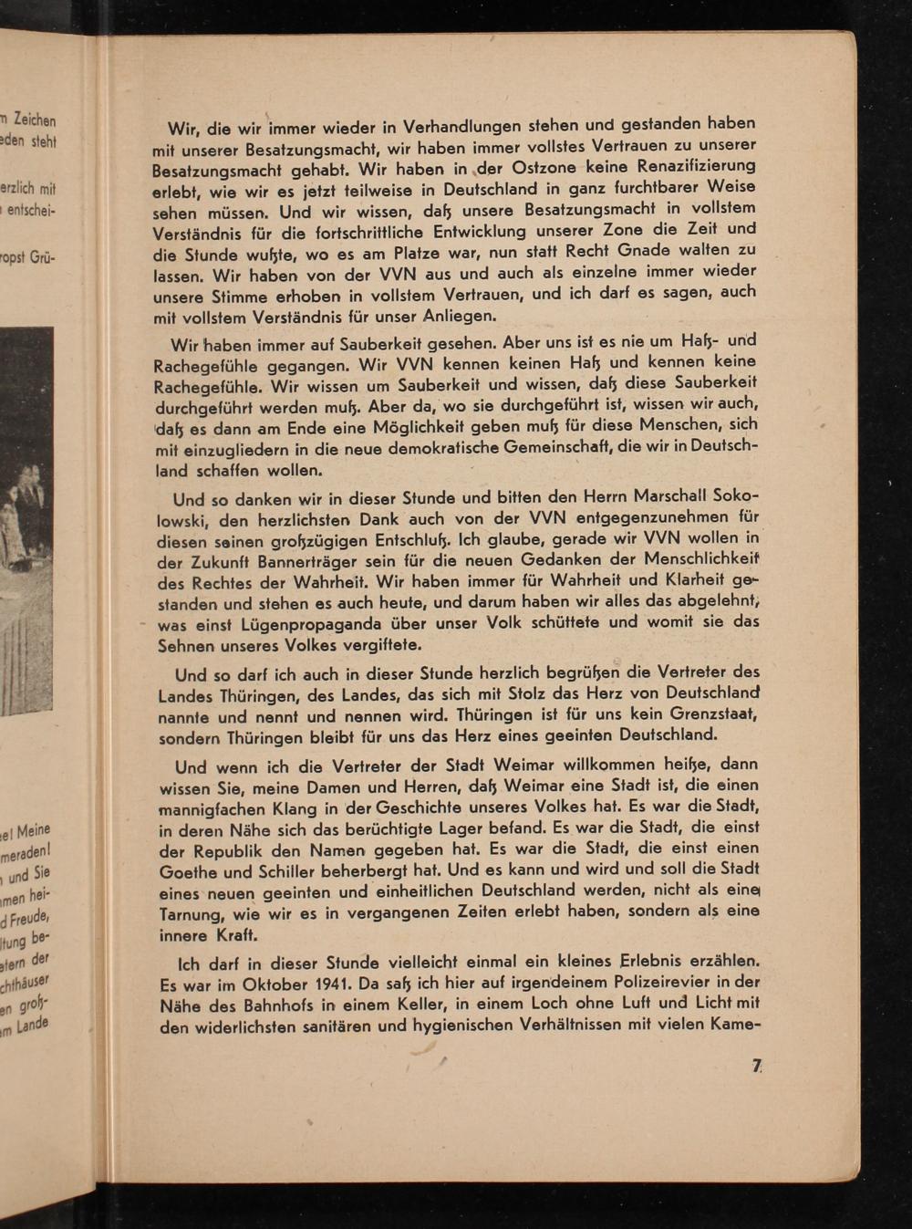 Wir, die wir immer wieder in Verhandlungen stehen und gestanden haben mit unserer Besatzungsmacht, wir haben immer vollstes Vertrauen zu unserer Besatzungsmacht gehabt. Wir haben in der Ostzone keine Renazifizierung erlebt, wie wir es jetzt teilweise in Deutschland in ganz furchtbarer Weise sehen müssen. Und wir wissen, daß unsere Besatzungsmacht in vollstem Verständnis für die fortschrittliche Entwicklung unserer Zone die Zeit und die Stunde wußte, wo es am Platze war, nun statt Recht Gnade walten zu lassen. Wir haben von der VVN aus und auch als einzelne immer wieder unsere Stimme erhoben in vollstem Vertrauen, und ich darf es sagen, auch mit vollstem Verständnis für unser Anliegen.