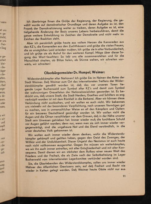 Widerstandskämpfer aller Nationen! Ich grüße Sie im Namen des Rates der Stadt Weimar. Daß Weimar zum Ort des internationalen Treffens der Widerstandskämpfer gewählt worden ist, dafs das vor unseren Toren liegende Lager Buchenwald zum Symbol aller KZ's und damit zum Symbol der wahnsinnigen Greueltaten der Nationalsozialisten geworden ist. Es bedrückt uns, daß unsere Stadt, die Stadt Herders, Goethes und Schillers so eng verknüpft worden ist mit dem Rückfall in die Barbarei. Aber wir können diese Verbindung nicht auslöschen, und wir wollen es auch nicht. Wir bekennen uns vielmehr mit der besonderen Verpflichtung, nach unserem Vermögen gut zu machen, was in unmenschlicher Weise an all den Kämpfern und Opfern für ein besseres Deutschland gesündigt worden ist. Wir wollen nicht die Augen und die Ohren verschließen vor dem Grauen, daß in der Nähe unserer Stadt sein Unwesen getrieben hat. Immer wieder muß die furchtbare Schuld vor Augen geführt werden; denn nur, wenn man sie sich immer wieder vergegenwärtigt, sind die ungeheure Not und das Elend verständlich, in die unser deutsches Volk gekommen ist.