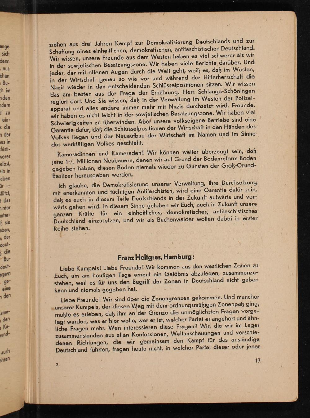 Ich glaube, die Demokratisierung unserer Verwaltung, ihre Durchsetzung mit anerkannten und tüchtigen Antifaschisten, wird eine Garantie dafür sein, daß es auch in diesem Teile Deutschlands in der Zukunft aufwärts und vor- wäris gehen wird. In diesem Sinne geloben wir Euch, auch in Zukunft unsere ganzen Kräfte für ein einheitliches, demokratisches, antifaschistisches Deutschland einzusetzen, und wir als Buchenwalder wollen dabei in erster