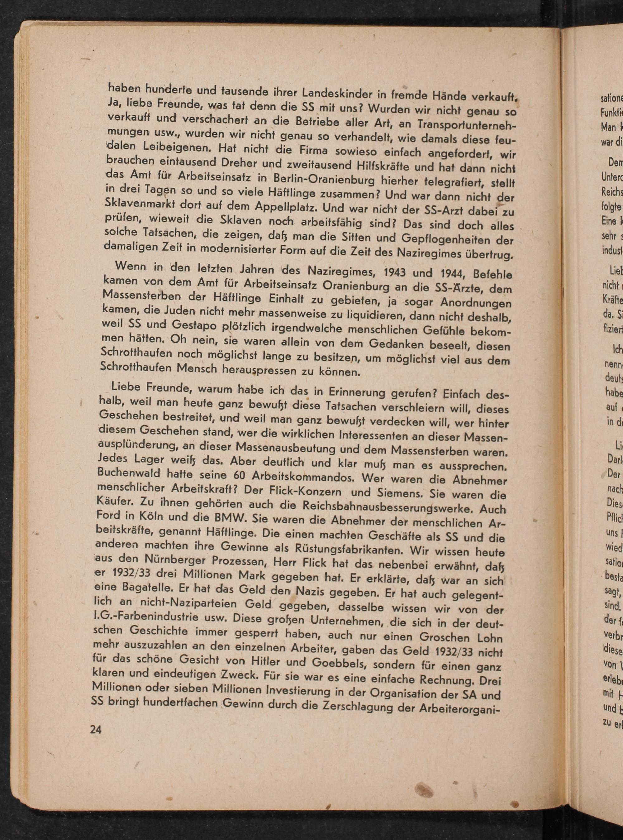 Liebe Freunde, warum habe ich das in Erinnerung gerufen? Einfach deshalb, weil man heute ganz bewußt diese Tatsachen verschleiern will, dieses Geschehen bestreitet, und weil man ganz bewußt verdecken will, wer hinter diesem Geschehen stand, wer die wirklichen Interessenten an dieser Massenausplünderung, an dieser Massenausbeutung und dem Massensterben waren. Jedes Lager weiß das. Aber deutlich und klar mufs man es aussprechen. Buchenwald hatte seine 60 Arbeitskommandos. Wer waren die Abnehmer menschlicher Arbeitskraft? Der Flick - Konzern und Siemens . Sie waren die Käufer. Zu ihnen gehörten auch die Reichsbahnausbesserungswerke. Auch Ford in Köln und die BMW . Sie waren die Abnehmer der menschlichen Arbeitskräfte, genannt Häftlinge. Die einen machten Geschäfte als SS und die anderen machten ihre Gewinne als Rüstungsfabrikanten. Wir wissen heute aus den Nürnberger Prozessen, Herr Flick hat das nebenbei erwähnt, daf er 1932/33 drei Millionen Mark gegeben hat. Er erklärte, daß war an sich eine Bagatelle. Er hat das Geld den Nazis gegeben. Er hat auch gelegentlich an nicht- Naziparteien Geld gegeben, dasselbe wissen wir von der I.G.- Farbenindustrie usw. Diese großen Unternehmen, die sich in der deutschen Geschichte immer gesperrt haben, auch nur einen Groschen Lohn mehr auszuzahlen an den einzelnen Arbeiter, gaben das Geld 1932/33 nicht für das schöne Gesicht von Hitler und Goebbels , sondern für einen ganz klaren und eindeutigen Zweck. Für sie war es eine einfache Rechnung. Drei Millionen oder sieben Millionen Investierung in der Organisation der SA und SS bringt hundertfachen Gewinn durch die Zerschlagung der Arbeiterorgani