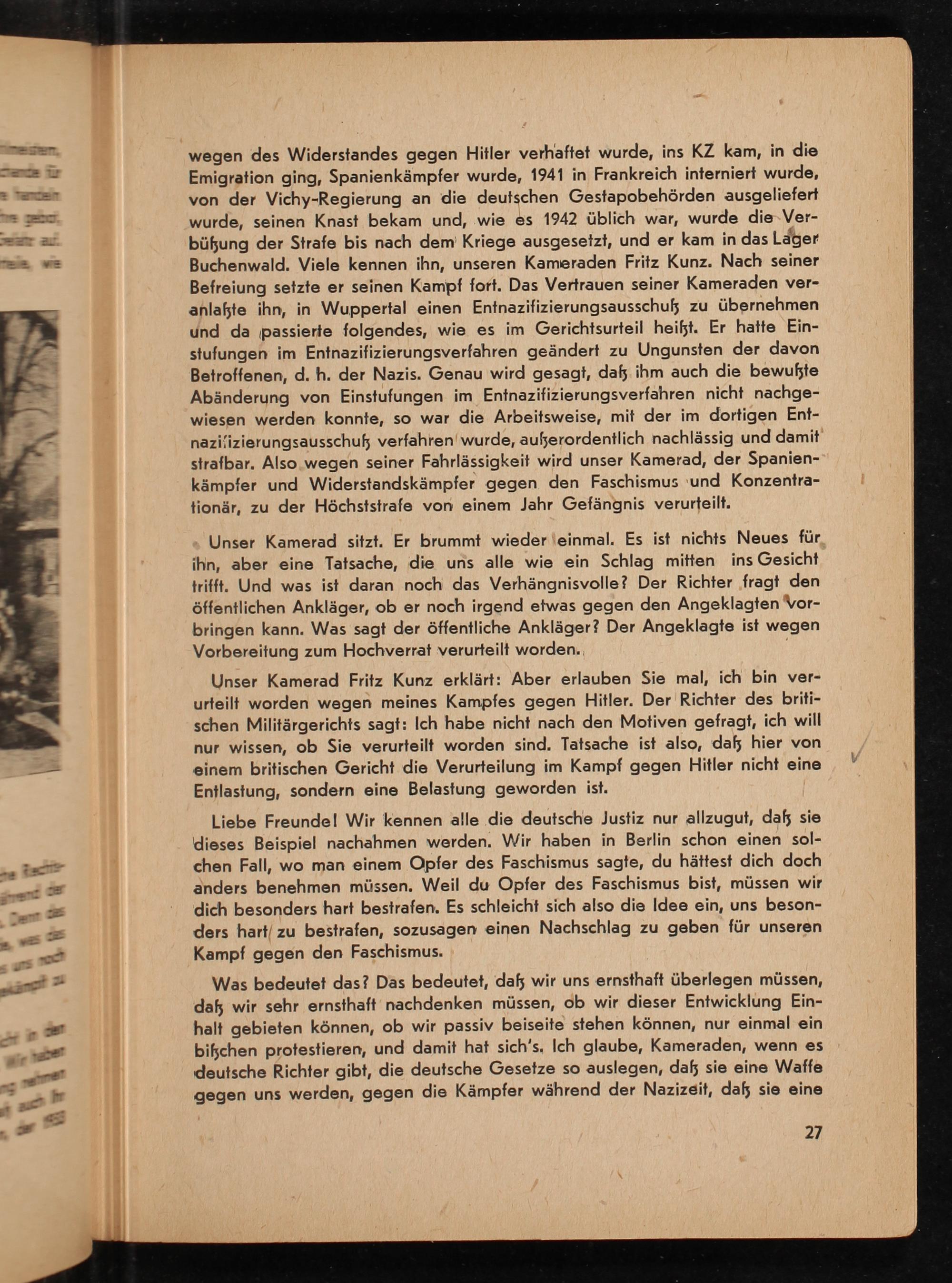 wegen des Widerstandes gegen Hitler verhaftet wurde, ins KZ kam, in die Emigration ging, Spanienkämpfer wurde, 1941 in Frankreich interniert wurde, von der Vichy- Regierung an die deutschen Gestapobehörden ausgeliefert wurde, seinen Knast bekam und, wie es 1942 üblich war, wurde die Verbüfung der Strafe bis nach dem Kriege ausgesetzt, und er kam in das Lager Buchenwald . Viele kennen ihn, unseren Kameraden Fritz Kunz. Nach seiner Befreiung setzte er seinen Kampf fort. Das Vertrauen seiner Kameraden veranlagte ihn, in Wuppertal einen Entnazifizierungsausschuß zu übernehmen und da passierte folgendes, wie es im Gerichtsurteil heißt. Er hatte Einstufungen im Entnazifizierungsverfahren geändert zu Ungunsten der davon Betroffenen, d. h. der Nazis. Genau wird gesagt, daß ihm auch die bewußte Abänderung von Einstufungen im Entnazifizierungsverfahren nicht nachgewiesen werden konnte, so war die Arbeitsweise, mit der im dortigen Entnazifizierungsausschus verfahren wurde, außerordentlich nachlässig und damit strafbar. Also wegen seiner Fahrlässigkeit wird unser Kamerad, der Spanienkämpfer und Widerstandskämpfer gegen den Faschismus und Konzentrationär, zu der Höchststrafe von einem Jahr Gefängnis verurteilt.