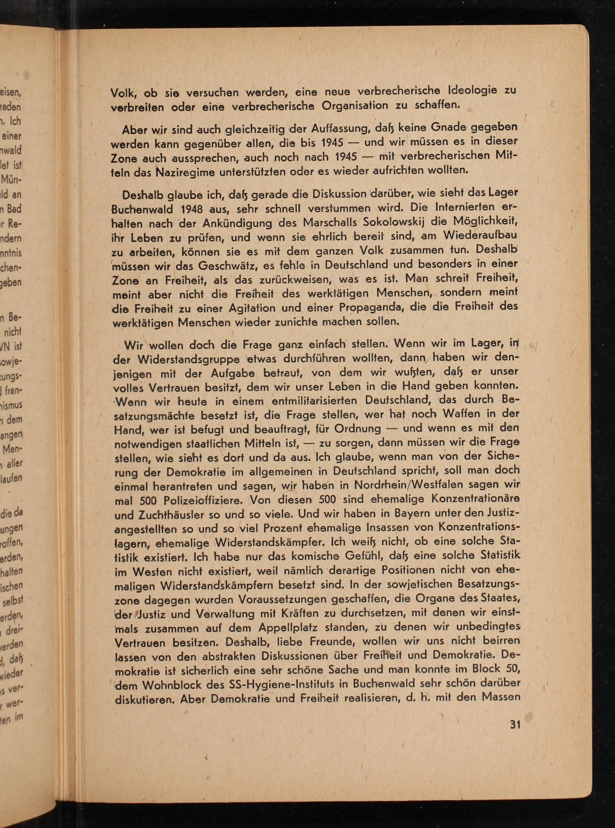 Deshalb glaube ich, da gerade die Diskussion darüber, wie sieht das Lager Buchenwald 1948 aus, sehr schnell verstummen wird. Die Internierten er- halten nach der Ankündigung des Marschalls Sokolowskij die Möglichkeit, ihr Leben zu prüfen, und wenn sie ehrlich bereit sind, am Wiederaufbau zu arbeiten, können sie es mit dem ganzen Volk zusammen tun. Deshalb müssen wir das Geschwätz, es fehle in Deutschland und besonders in einer Zone an Freiheit, als das zurückweisen, was es ist. Man schreit Freiheit, meint aber nicht die Freiheit des werktätigen Menschen, sondern meint die Freiheit zu einer Agitation und einer Propaganda, die die Freiheit des werktätigen Menschen wieder zunichte machen sollen.