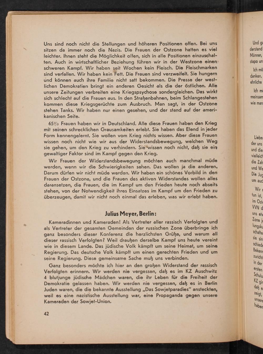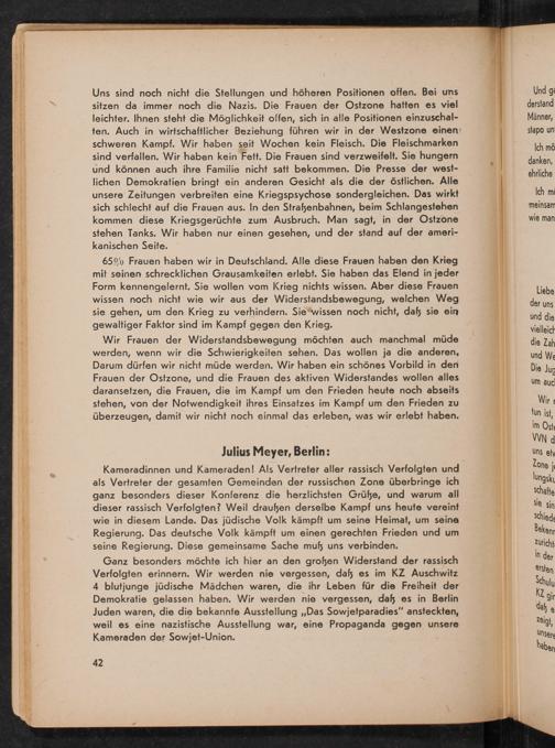 Kameradinnen und Kameraden! Als Vertreter aller rassisch Verfolgten und als Vertreter der gesamten Gemeinden der russischen Zone überbringe ich ganz besonders dieser Konferenz die herzlichsten Grüße, und warum all dieser rassisch Verfolgten? Weil draußen derselbe Kampf uns heute vereint wie in diesem Lande. Das jüdische Volk kämpft um seine Heimat, um seine Regierung. Das deutsche Volk kämpft um einen gerechten Frieden und um seine Regierung. Diese gemeinsame Sache muß uns verbinden.