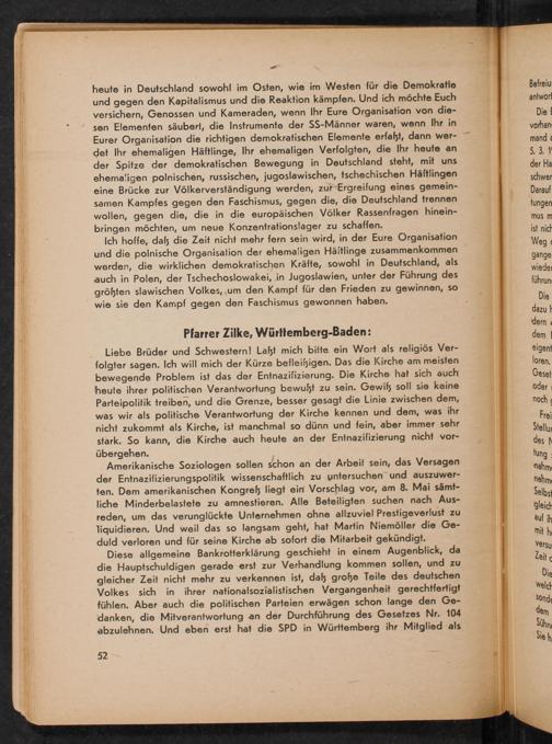Liebe Brüder und Schwestern! Laft mich bitte ein Wort als religiös Verfolgter sagen. Ich will mich der Kürze befleißigen. Das die Kirche am meisten bewegende Problem ist das der Entnazifizierung. Die Kirche hat sich auch heute ihrer politischen Verantwortung bewußt zu sein. Gewifs soll sie keine Parteipolitik treiben, und die Grenze, besser gesagt die Linie zwischen dem, was wir als politische Verantwortung der Kirche kennen und dem, was ihr nicht zukommt als Kirche, ist manchmal so dünn und fein, aber immer sehr stark. So kann, die Kirche auch heute an der Entnazifizierung nicht vorübergehen.