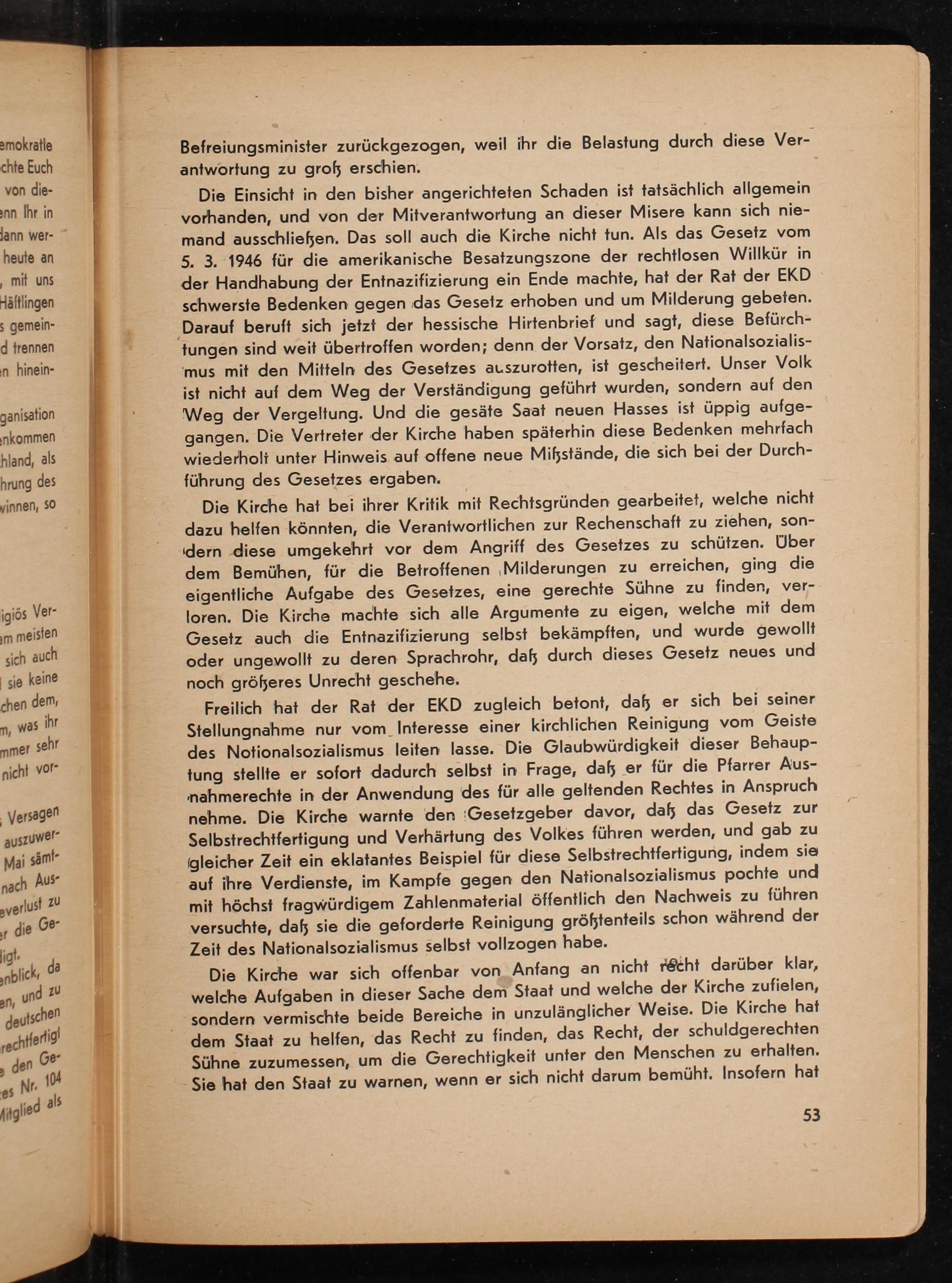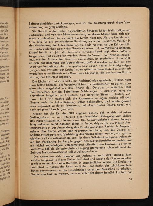 Die Einsicht in den bisher angerichteten Schaden ist tatsächlich allgemein vorhanden, und von der Mitverantwortung an dieser Misere kann sich niemand ausschließen. Das soll auch die Kirche nicht tun. Als das Gesetz vom 5. 3. 1946 für die amerikanische Besatzungszone der rechtlosen Willkür in der Handhabung der Entnazifizierung ein Ende machte, hat der Rat der EKD schwerste Bedenken gegen das Gesetz erhoben und um Milderung gebeten. Darauf beruft sich jetzt der hessische Hirtenbrief und sagt, diese Befürchtungen sind weit übertroffen worden; denn der Vorsatz, den Nationalsozialismus mit den Mitteln des Gesetzes auszurotten, ist gescheitert. Unser Volk ist nicht auf dem Weg der Verständigung geführt wurden, sondern auf den Weg der Vergeltung. Und die gesäte Saat neuen Hasses ist üppig aufgegangen. Die Vertreter der Kirche haben späterhin diese Bedenken mehrfach wiederholt unter Hinweis auf offene neue Miẞstände, die sich bei der Durchführung des Gesetzes ergaben.