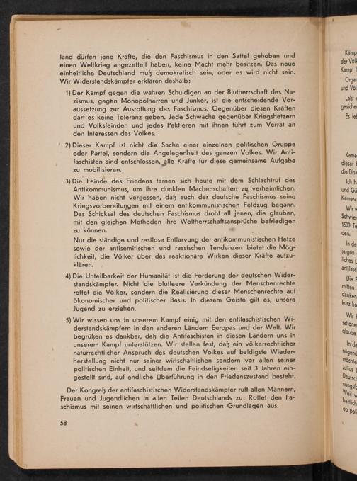 5) Wir wissen uns in unserem Kampf einig mit den antifaschistischen Widerstandskämpfern in den anderen Ländern Europas und der Welt. Wir begrüßen es dankbar, daß die Antifaschisten in diesen Ländern uns in unserem Kampf unterstützen. Wir stellen fest, daß ein völkerrechtlicher naturrechtlicher Anspruch des deutschen Volkes auf baldigste Wiederherstellung nicht nur seiner wirtschaftlichen sondern vor allen seiner politischen Einheit, und seitdem die Feindseligkeiten seit 3 Jahren eingestellt sind, auf endliche Überführung in den Friedenszustand besteht. Der Kongres der antifaschistischen Widerstandskämpfer ruft allen Männern, Frauen und Jugendlichen in allen Teilen Deutschlands zu: Rottet den Faschismus mit seinen wirtschaftlichen und politischen Grundlagen aus.