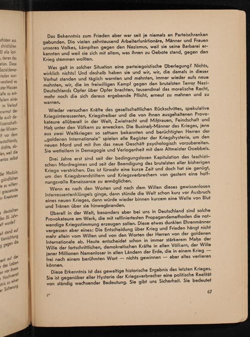Das Bekenntnis zum Frieden aber war seit je niemals an Parteischranken gebunden. Die vielen zehntausend Arbeiterfunktionäre, Männer und Frauen unseres Volkes, kämpften gegen den Nazismus, weil sie seine Barbarei erkannten und weil sie sich mit allem, was ihnen zu Gebote stand, gegen den Krieg stemmen wollten.