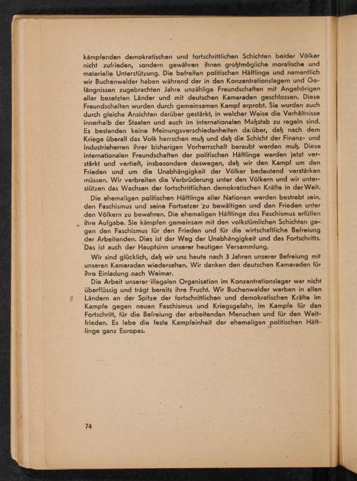 Die Arbeit unserer illegalen Organisation im Konzentrationslager war nicht überflüssig und trägt bereits ihre Frucht. Wir Buchenwalder werben in allen Ländern an der Spitze der fortschrittlichen und demokratischen Kräfte im Kampfe gegen neuen Faschismus und Kriegsgefahr, im Kampfe für den Fortschritt, für die Befreiung der arbeitenden Menschen und für den Weltfrieden. Es lebe die feste Kampfeinheit der ehemaligen politischen Häftlinge ganz Europas .