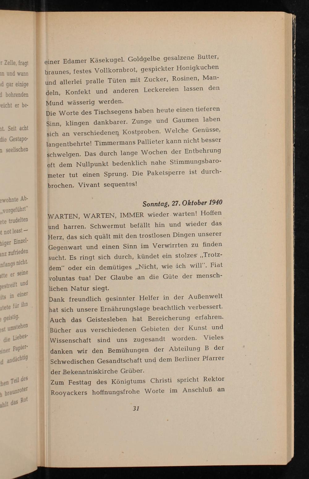 Sonntag, 27. Oktober 1940 WARTEN, WARTEN, IMMER wieder. warten! Hoffen und harren. Schwermut befällt hin und wieder das Herz, das sich quält mit den trostlosen Dingen unserer Gegenwart und einen Sinn im Verwirrten zu finden sucht. Es ringt sich durch, kündet ein stolzes’„Trotz- dem‘ oder ein demütiges„Nicht, wie ich will’. Fiat voluntas tua! Der Glaube an die Güte der mensch- lichen Natur siegt. Dank freundlich gesinnter Helfer in der Außenwelt hat sich unsere Ernährungslage beachtlich verbessert. Auch das Geistesleben hat Bereicherung erfahren. Bücher aus verschiedenen Gebieten der Kunst und Wissenschaft sind uns zugesandt worden. Vieles danken wir den Bemühungen der Abteilung B der Schwedischen Gesandtschaft und dem Berliner Pfarrer der Bekenntniskirche Grüber. Zum Festtag des Königtums Christi spricht Rektor Rooyackers hoffnungsfrohe Worte im Anschluß an