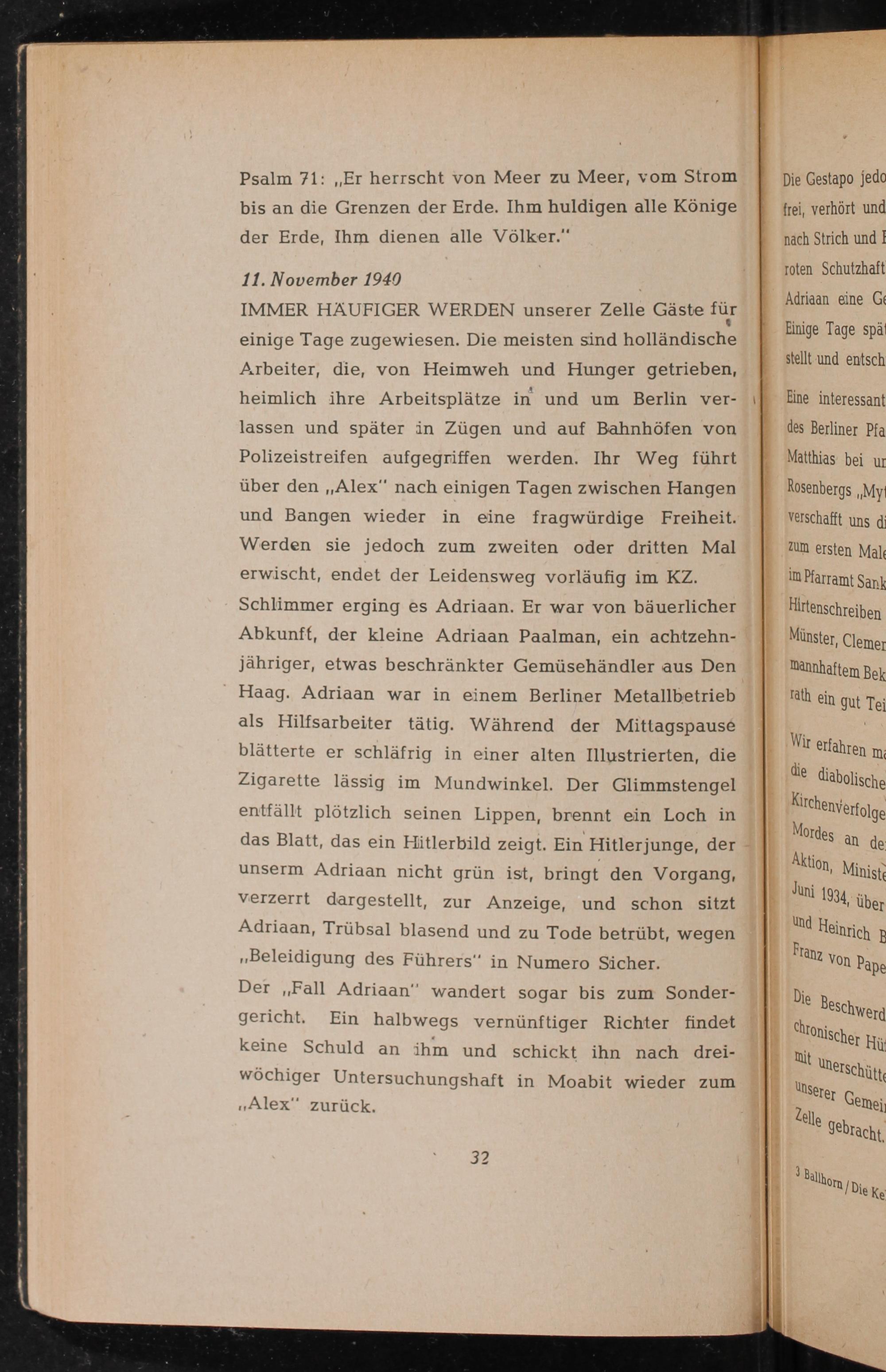 IMMER HÄUFIGER WERDEN unserer Zelle Gäste für einige Tage zugewiesen. Die meisten sind holländische Arbeiter, die, von Heimweh und Hunger getrieben, heimlich ihre Arbeitsplätze in und um Berlin verlassen und später in Zügen und auf Bahnhöfen von Polizeistreifen aufgegriffen werden. Ihr Weg führt über den ,, Alex" nach einigen Tagen zwischen Hangen und Bangen wieder in eine fragwürdige Freiheit. Werden sie jedoch zum zweiten oder dritten Mal erwischt, endet der Leidensweg vorläufig im KZ. Schlimmer erging es Adriaan. Er war von bäuerlicher Abkunft, der kleine Adriaan Paalman, ein achtzehnjähriger, etwas beschränkter Gemüsehändler aus Den Haag. Adriaan war in einem Berliner Metallbetrieb als Hilfsarbeiter tätig. Während der Mittagspause blätterte er schläfrig in einer alten Illustrierten, die Zigarette lässig im Mundwinkel. Der Glimmstengel entfällt plötzlich seinen Lippen, brennt ein Loch in das Blatt, das ein Hitlerbild zeigt. Ein Hitlerjunge, der unserm Adriaan nicht grün ist, bringt den Vorgang, verzerrt dargestellt, zur Anzeige, und schon sitzt Adriaan, Trübsal blasend und zu Tode betrübt, wegen ,, Beleidigung des Führers" in Numero Sicher. Der Fall Adriaan" wandert sogar bis zum Sondergericht. Ein halbwegs vernünftiger Richter findet keine Schuld an ihm und schickt ihn nach dreiwöchiger Untersuchungshaft in Moabit wieder zum ,, Alex" zurück.