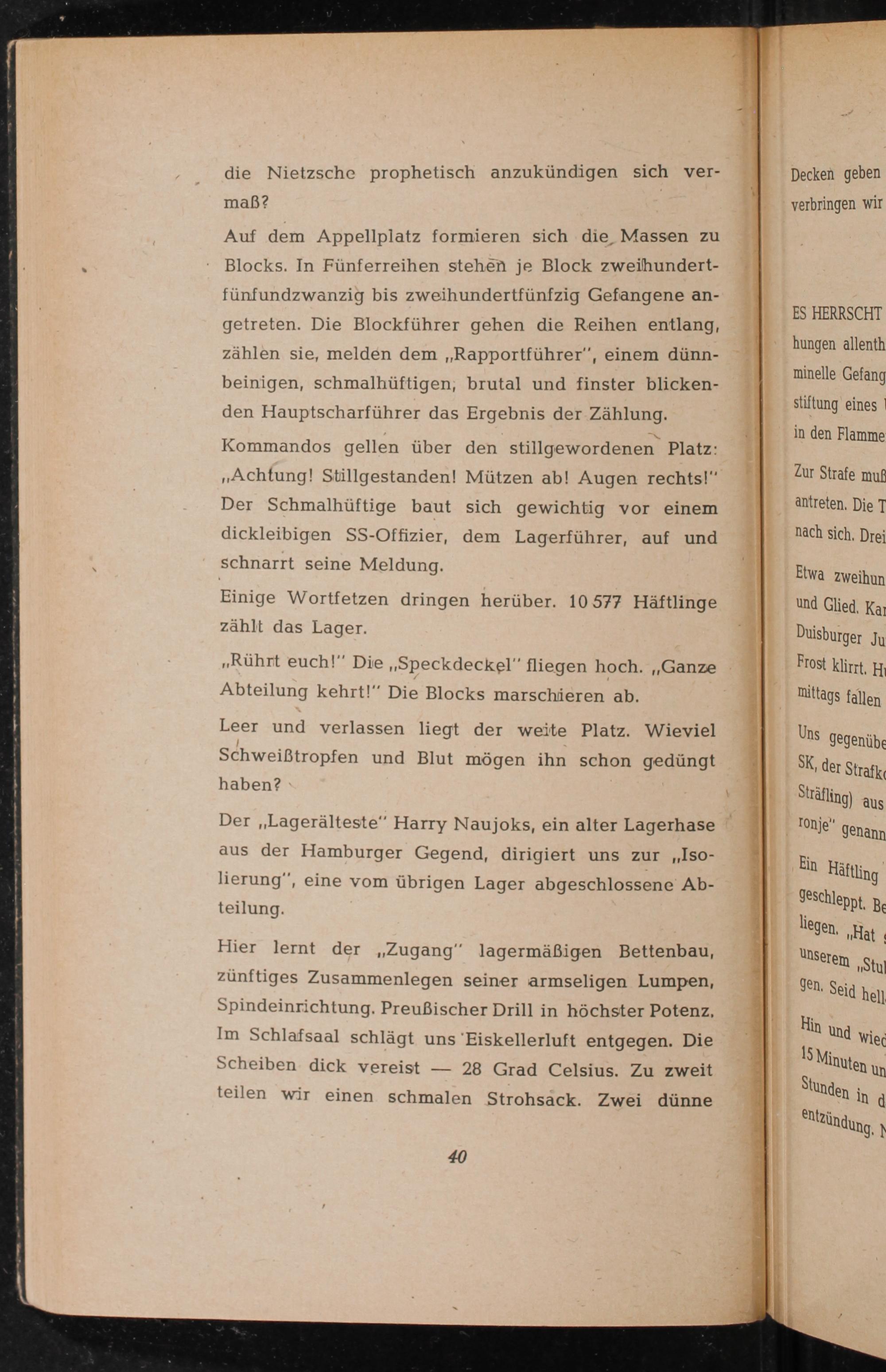 Auf dem Appellplatz formieren sich die Massen zu Blocks. In Fünferreihen stehen je Block zweihundertfünfundzwanzig bis zweihundertfünfzig Gefangene angetreten. Die Blockführer gehen die Reihen entlang, zählen sie, melden dem ,, Rapportführer", einem dünnbeinigen, schmalhüftigen, brutal und finster blickenden Hauptscharführer das Ergebnis der Zählung. Kommandos gellen über den stillgewordenen Platz: ,, Achtung! Stillgestanden! Mützen ab! Augen rechts!" Der Schmalhüftige baut sich gewichtig vor einem dickleibigen SS - Offizier, dem Lagerführer, auf und schnarrt seine Meldung.