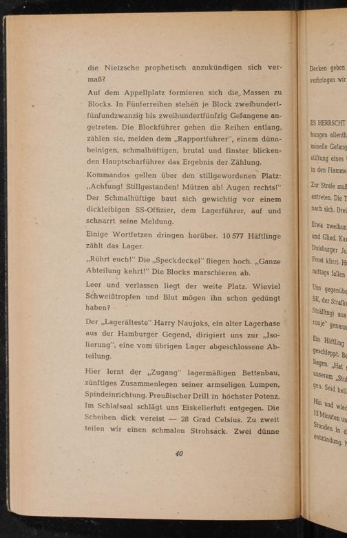 Der ,, Lagerälteste" Harry Naujoks , ein alter Lagerhase aus der Hamburger Gegend, dirigiert uns zur ,, Isolierung", eine vom übrigen Lager abgeschlossene Abteilung.