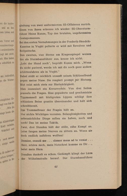 gleitung von zwei uniformierten SS - Offizieren zurück. Einen von ihnen erkenne ich wieder: SS- Obersturmführer Heinz Kunze, Typ des brutalen, ungehemmten Gestapomannes.