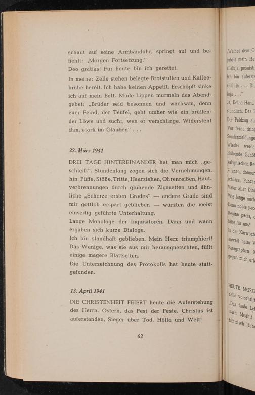 DREI TAGE HINTEREINANDER hat man mich ,, geschleift". Stundenlang zogen sich die Vernehmungen. hin. Püffe, Stöße, Tritte, Haarziehen, Ohrenreißen, Hautverbrennungen durch glühende Zigaretten und ähnliche ,, Scherze ersten Grades" mir gottlob erspart geblieben einseitig geführte Unterhaltung.