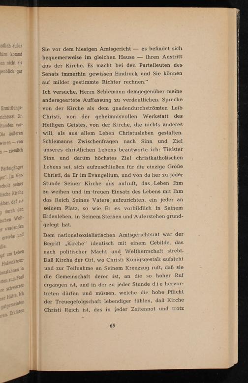 Dem nationalsozialistischen Amtsgerichtsrat war der Begriff ,, Kirche" identisch mit einem Gebilde, das nach politischer Macht und Weltherrschaft strebt. Daß Kirche der Ort, wo Christi Königsgestalt aufsteht und zur Teilnahme an Seinem Kreuzzug ruft, daß sie die Gemeinschaft derer ist, an die so hoher Ruf ergangen ist, und in der zu jeder Stunde die hervortreten dürfen und müssen, welche die hohe Pflicht der Treuegefolgschaft lebendiger fühlen, daß Kirche Christi Reich ist, das in jeder Zeitennot und trotz