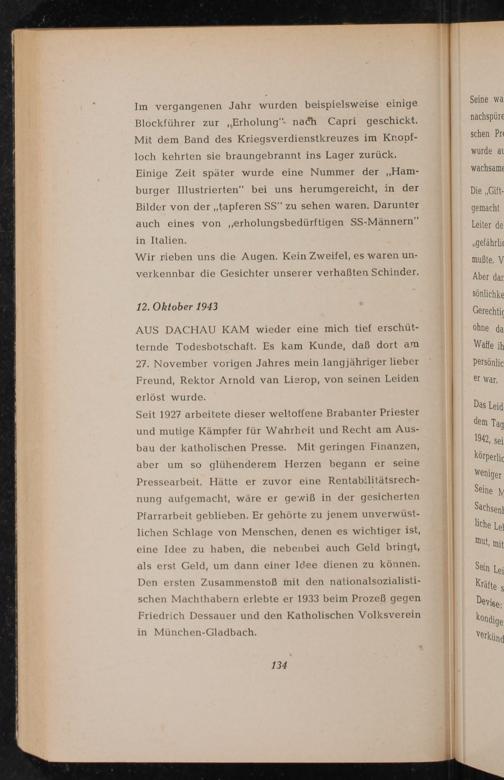 Im vergangenen Jahr wurden beispielsweise einige Blockführer zur Erholung" nach Capri geschickt. Mit dem Band des Kriegsverdienstkreuzes im Knopfloch kehrten sie braungebrannt ins Lager zurück. Einige Zeit später wurde eine Nummer der ,, Hamburger Illustrierten" bei uns herumgereicht, in der Bilder von der ,, tapferen SS" zu sehen waren. Darunter auch eines von erholungsbedürftigen SS- Männern" in Italien .