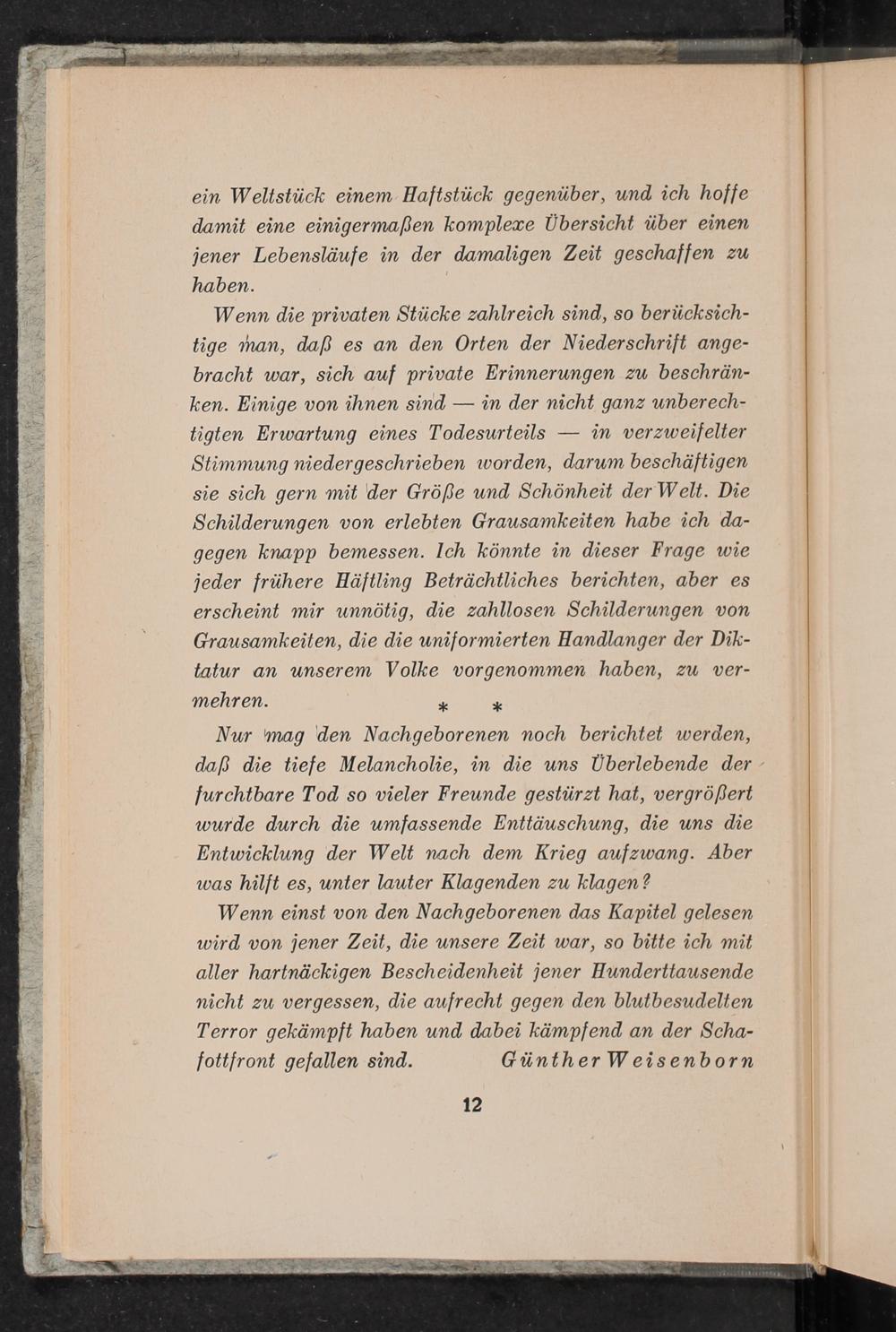 Wenn die privaten Stücke zahlreich sind, so berücksichtige man, daß es an den Orten der Niederschrift angebracht war, sich auf private Erinnerungen zu beschränken. Einige von ihnen sind in der nicht ganz unberechtigten Erwartung eines Todesurteils in verzweifelter Stimmung niedergeschrieben worden, darum beschäftigen sie sich gern mit der Größe und Schönheit der Welt. Die Schilderungen von erlebten Grausamkeiten habe ich dagegen knapp bemessen. Ich könnte in dieser Frage wie jeder frühere Häftling Beträchtliches berichten, aber es erscheint mir unnötig, die zahllosen Schilderungen von Grausamkeiten, die die uniformierten Handlanger der Diktatur an unserem Volke vorgenommen haben, zu vermehren.