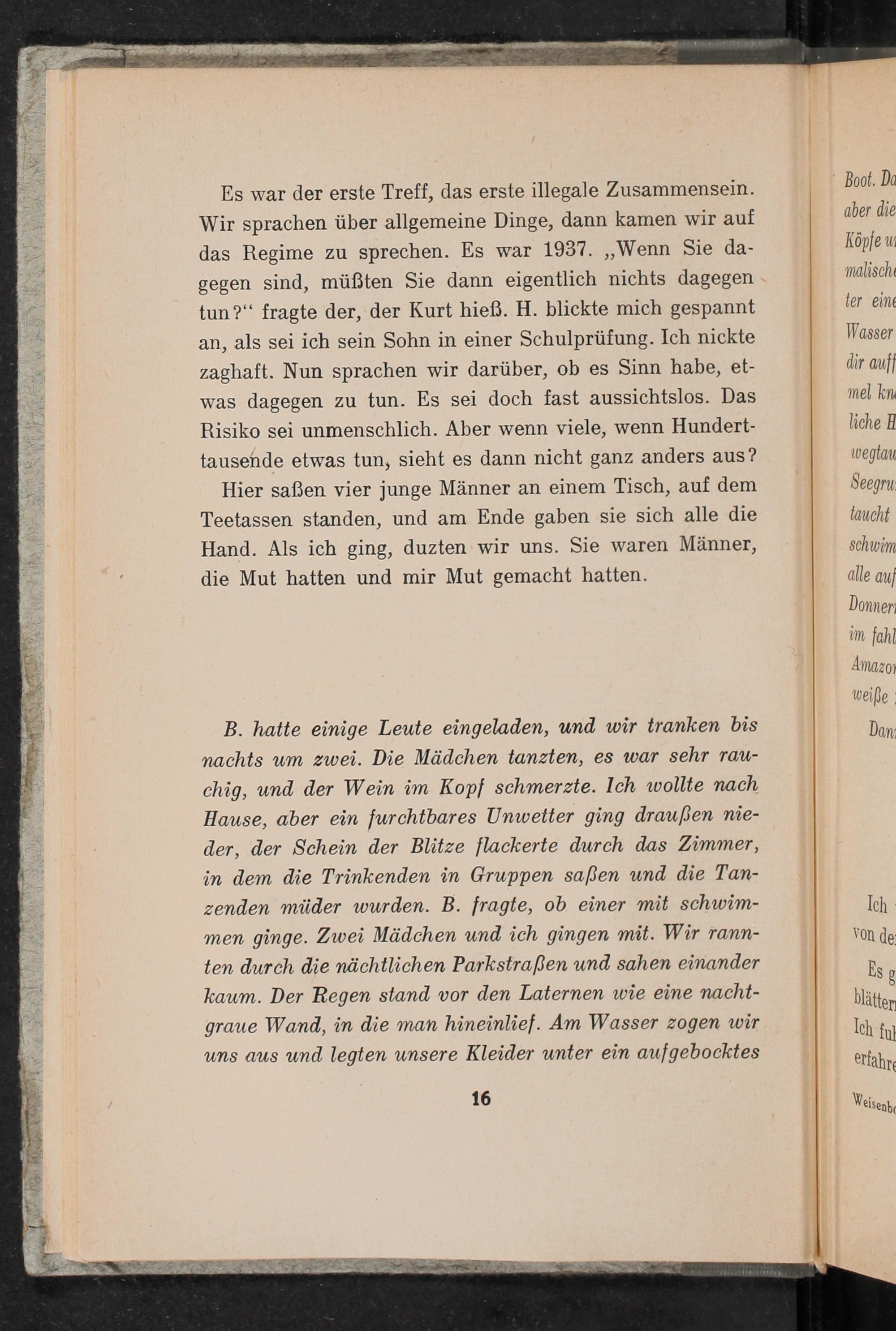 Es war der erste Treff, das erste illegale Zusammensein. Wir sprachen über allgemeine Dinge, dann kamen wir auf das Regime zu sprechen. Es war 1937. ,, Wenn Sie dagegen sind, müßten Sie dann eigentlich nichts dagegen tun?" fragte der, der Kurt hieß. H. blickte mich gespannt an, als sei ich sein Sohn in einer Schulprüfung. Ich nickte zaghaft. Nun sprachen wir darüber, ob es Sinn habe, etwas dagegen zu tun. Es sei doch fast aussichtslos. Das Risiko sei unmenschlich. Aber wenn viele, wenn Hunderttausende etwas tun, sieht es dann nicht ganz anders aus? Hier saßen vier junge Männer an einem Tisch, auf dem Teetassen standen, und am Ende gaben sie sich alle die Hand. Als ich ging, duzten wir uns. Sie waren Männer, die Mut hatten und mir Mut gemacht hatten.