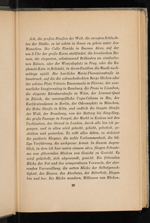 Ach, die großen Straßen der Welt, die erregten Schluchten der Städte, es ist schön in ihnen zu gehen unter den Menschen. Die Calle Florida in Buenos Aires , auf der um 5 Uhr der große Korso stattfindet, die kreolischen Damen, die eleganten, zehntausend Brillanten an zimtfarbenen Hälsen, oder der Wenzelsplatz in Prag , oder die Esplanati- Katu in Helsinki , in deren Pavillon die Musik nachmittags spielt. Die herrliche Maria- Theresienstraße in Innsbruck , auf die die schneebedeckten Berge blicken oder der schöne Platz Vittorio Emmanuelo in Florenz , der sommerliche Jungfernstieg in Hamburg, die Praia in Lissabon , die elegante Kärntnerstraße in Wien, der Limmat - Quai in Zürich, die unvergeßliche Copa- Cabana in Rio , der Kurfürstendamm in Berlin, der Odeonsplatz in München , die Hohe Straße in Köln , und endlich die längste Straße der Welt, der Broadway, von der Battery bis Sing- Sing, die große Passage in Neapel, der Markt in Krakau mit den Tuchlauben, der Strand in London , durch alle bin ich gegangen, und in allen wird gelacht, geliebt, gebettelt, gestritten und gestorben. Es rollt alles dahin, es stolziert die gealterte Eleganz, die noble Verkommenheit, die billige Verführung, die aschgraue Armut. In diesem Augenblick, in dem ich hier unten einsam sitze, fliegen Schwärme von glitzernden Blicken von Gesicht zu Gesicht. Es wird gelächelt, sich abgewandt, genickt. Die flehenden Blicke der Not und des wimpernlosen Vorwurfs, der starrenden Verzweiflung, die satten Blicke der Selbstgerechtigkeit, des Hasses, des Abscheus, der Bitterkeit, fliegen hin und her. Die Blicke wandern, Millionen von Blicken,