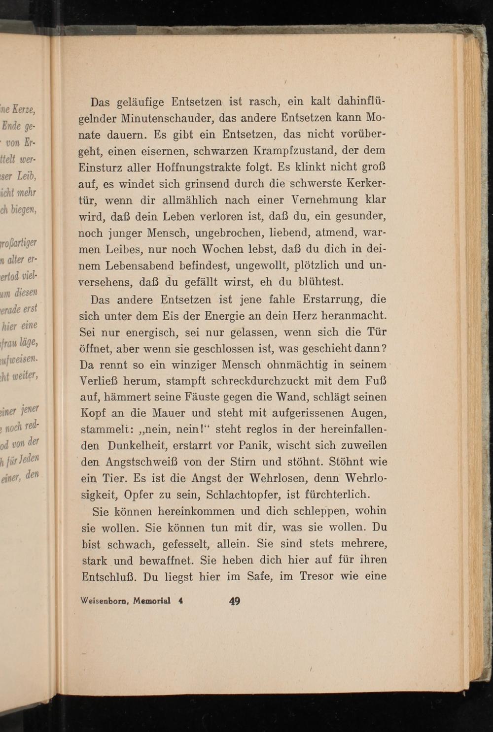 Das geläufige Entsetzen ist rasch, ein kalt dahinflügelnder Minutenschauder, das andere Entsetzen kann Monate dauern. Es gibt ein Entsetzen, das nicht vorübergeht, einen eisernen, schwarzen Krampfzustand, der dem Einsturz aller Hoffnungstrakte folgt. Es klinkt nicht groß auf, es windet sich grinsend durch die schwerste Kerkertür, wenn dir allmählich nach einer Vernehmung klar wird, daß dein Leben verloren ist, daß du, ein gesunder, noch junger Mensch, ungebrochen, liebend, atmend, warmen Leibes, nur noch Wochen lebst, daß du dich in deinem Lebensabend befindest, ungewollt, plötzlich und unversehens, daß du gefällt wirst, eh du blühtest.