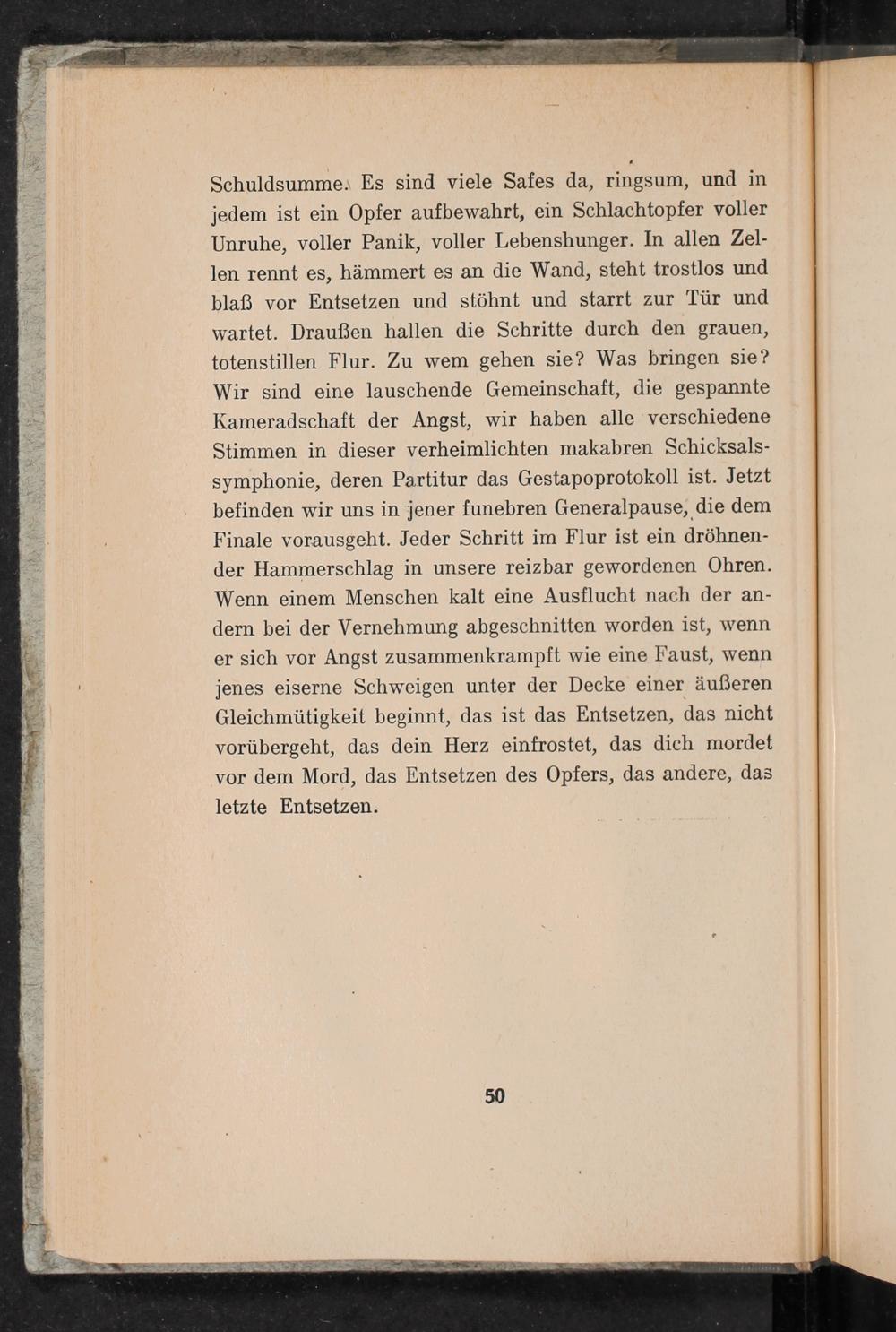 Schuldsumme. Es sind viele Safes da, ringsum, und in jedem ist ein Opfer aufbewahrt, ein Schlachtopfer voller Unruhe, voller Panik, voller Lebenshunger. In allen Zellen rennt es, hämmert es an die Wand, steht trostlos und blaß vor Entsetzen und stöhnt und starrt zur Tür und wartet. Draußen hallen die Schritte durch den grauen, totenstillen Flur. Zu wem gehen sie? Was bringen sie? Wir sind eine lauschende Gemeinschaft, die gespannte Kameradschaft der Angst, wir haben alle verschiedene Stimmen in dieser verheimlichten makabren Schicksalssymphonie, deren Partitur das Gestapoprotokoll ist. Jetzt befinden wir uns in jener funebren Generalpause, die dem Finale vorausgeht. Jeder Schritt im Flur ist ein dröhnender Hammerschlag in unsere reizbar gewordenen Ohren. Wenn einem Menschen kalt eine Ausflucht nach der andern bei der Vernehmung abgeschnitten worden ist, wenn er sich vor Angst zusammenkrampft wie eine Faust, wenn jenes eiserne Schweigen unter der Decke einer äußeren Gleichmütigkeit beginnt, das ist das Entsetzen, das nicht vorübergeht, das dein Herz einfrostet, das dich mordet vor dem Mord, das Entsetzen des Opfers, das andere, das letzte Entsetzen.