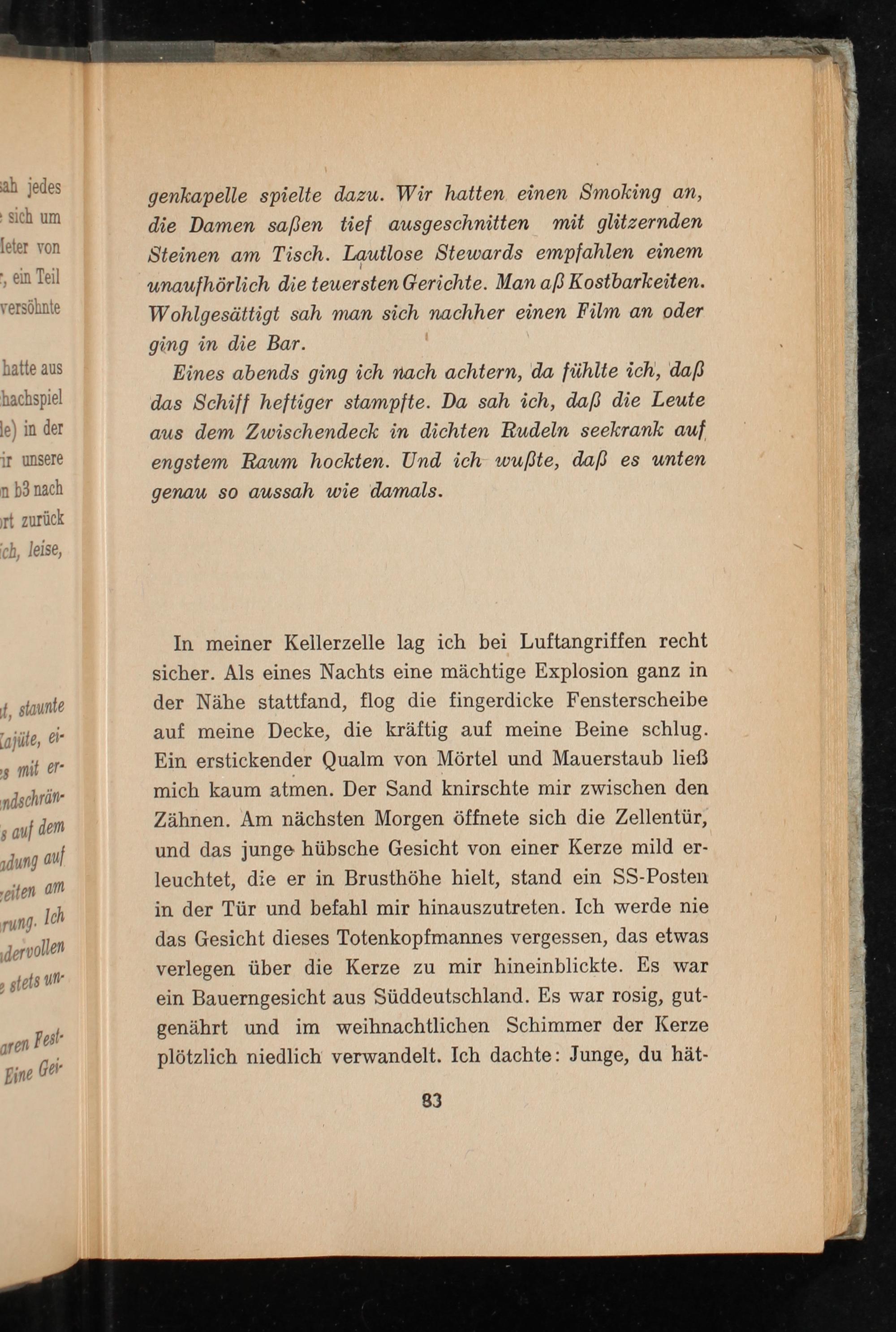 In meiner Kellerzelle lag ich bei Luftangriffen recht sicher. Als eines Nachts eine mächtige Explosion ganz in der Nähe stattfand, flog die fingerdicke Fensterscheibe auf meine Decke, die kräftig auf meine Beine schlug. Ein erstickender Qualm von Mörtel und Mauerstaub ließ mich kaum atmen. Der Sand knirschte mir zwischen den Zähnen. Am nächsten Morgen öffnete sich die Zellentür, und das junge hübsche Gesicht von einer Kerze mild er- leuchtet, die er in Brusthöhe hielt, stand ein SS-Posten in der Tür und befahl mir hinauszutreten. Ich werde nie das Gesicht dieses Totenkopfmannes vergessen, das etwas verlegen über die Kerze zu mir hineinblickte. Es war ein Bauerngesicht aus Süddeutschland. Es war rosig, gut- genährt und im weihnachtlichen Schimmer der Kerze plötzlich niedlich verwandelt. Ich dachte: Junge, du hät-