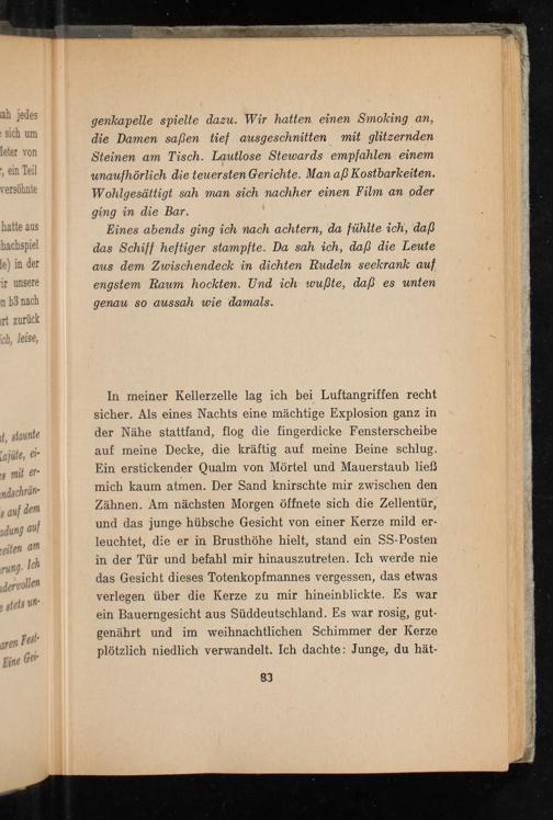 In meiner Kellerzelle lag ich bei Luftangriffen recht sicher. Als eines Nachts eine mächtige Explosion ganz in der Nähe stattfand, flog die fingerdicke Fensterscheibe auf meine Decke, die kräftig auf meine Beine schlug. Ein erstickender Qualm von Mörtel und Mauerstaub ließ mich kaum atmen. Der Sand knirschte mir zwischen den Zähnen. Am nächsten Morgen öffnete sich die Zellentür, und das junge hübsche Gesicht von einer Kerze mild er- leuchtet, die er in Brusthöhe hielt, stand ein SS-Posten in der Tür und befahl mir hinauszutreten. Ich werde nie das Gesicht dieses Totenkopfmannes vergessen, das etwas verlegen über die Kerze zu mir hineinblickte. Es war ein Bauerngesicht aus Süddeutschland. Es war rosig, gut- genährt und im weihnachtlichen Schimmer der Kerze plötzlich niedlich verwandelt. Ich dachte: Junge, du hät-