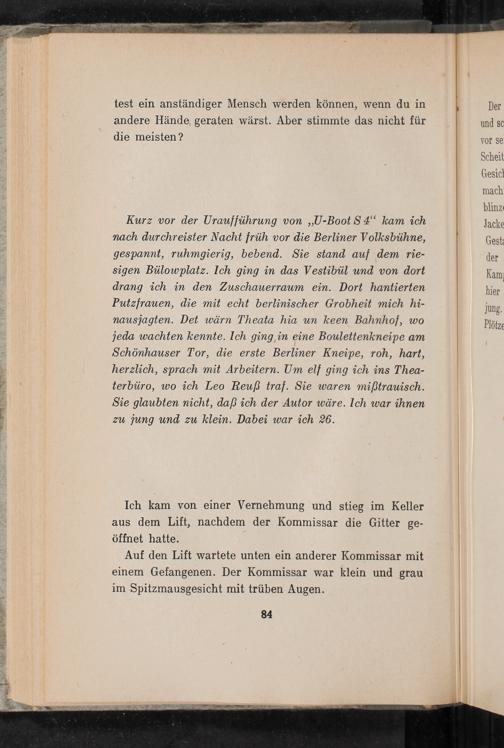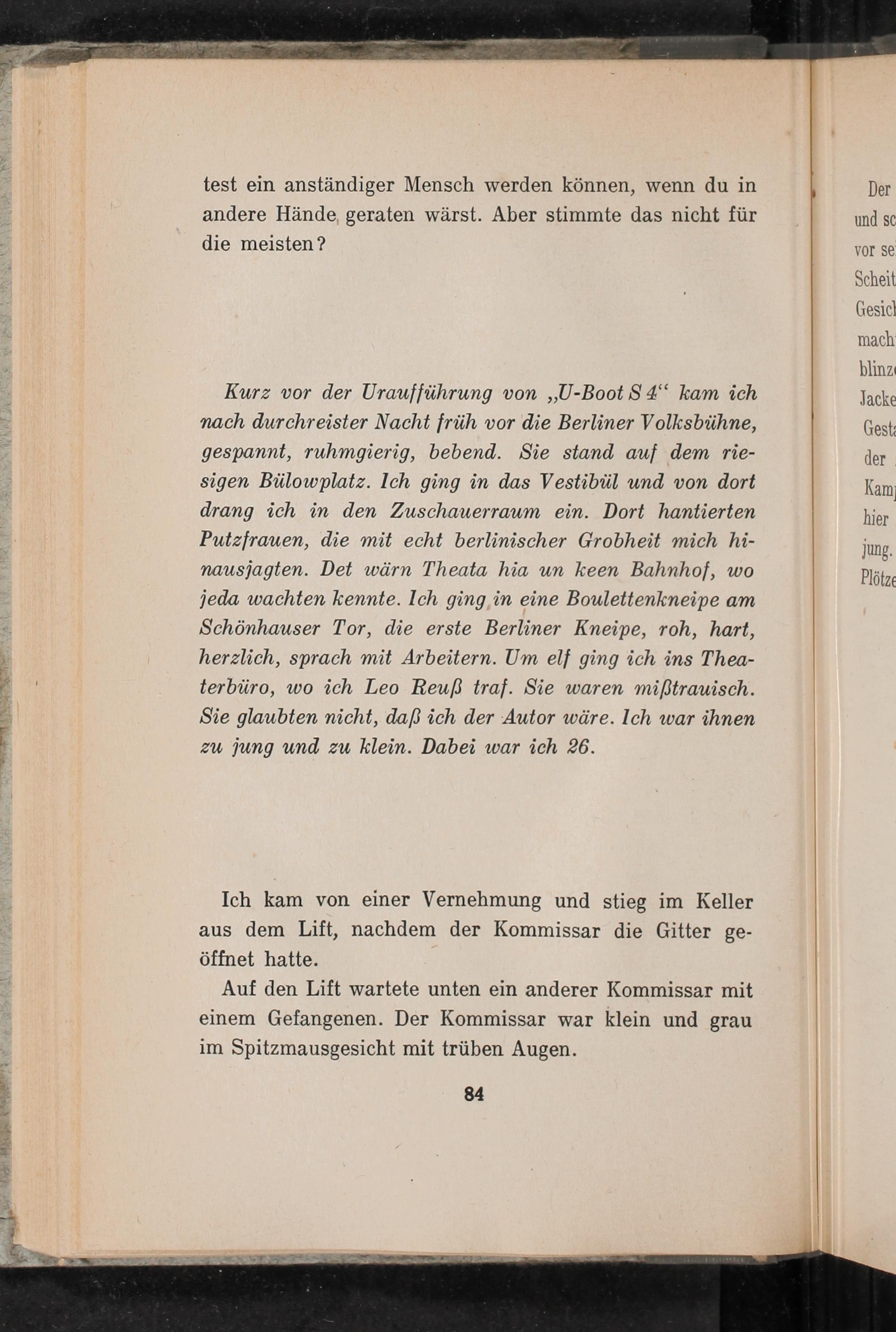 Kurz vor der Uraufführung von U- Boot S 4" kam ich nach durchreister Nacht früh vor die Berliner Volksbühne, gespannt, ruhmgierig, bebend. Sie stand auf dem riesigen Bülowplatz. Ich ging in das Vestibül und von dort drang ich in den Zuschauerraum ein. Dort hantierten Putzfrauen, die mit echt berlinischer Grobheit mich hinausjagten. Det wärn Theata hia un keen Bahnhof, wo jeda wachten kennte. Ich ging in eine Boulettenkneipe am Schönhauser Tor, die erste Berliner Kneipe, roh, hart, herzlich, sprach mit Arbeitern. Um elf ging ich ins Theaterbüro, wo ich Leo Reuß traf. Sie waren mißtrauisch. Sie glaubten nicht, daß ich der Autor wäre. Ich war ihnen zu jung und zu klein. Dabei war ich 26.