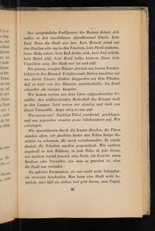 Sie gehörte Niemandem, sie war nicht mehr belangbar, sie verweste bescheiden. Man kann eine Stadt nicht begraben, man läßt sie stehen und geht davon, zum Teufel.