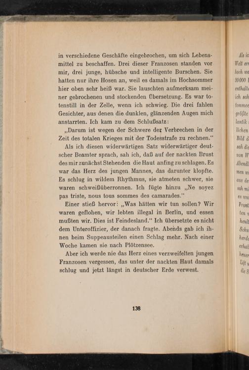 Einer stieß hervor: ,, Was hätten wir tun sollen? Wir waren geflohen, wir lebten illegal in Berlin , und essen mußten wir. Dies ist Feindesland." Ich übersetzte es nicht dem Unteroffizier, der danach fragte. Abends gab ich ihnen beim Suppeausteilen einen Schlag mehr. Nach einer Woche kamen sie nach Plötzensee.