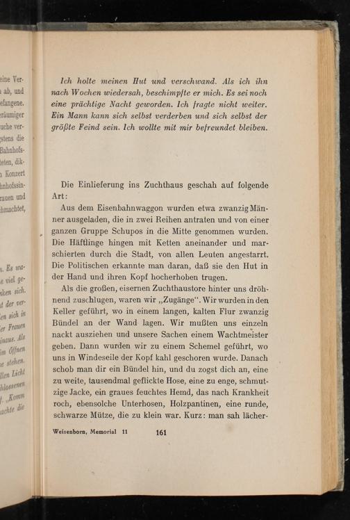 Als die großen, eisernen Zuchthaustore hinter uns dröhnend zuschlugen, waren wir ,, Zugänge". Wir wurden in den Keller geführt, wo in einem langen, kalten Flur zwanzig Bündel an der Wand lagen. Wir mußten uns einzeln nackt ausziehen und unsere Sachen einem Wachtmeister geben. Dann wurden wir zu einem Schemel geführt, wo uns in Windeseile der Kopf kahl geschoren wurde. Danach schob man dir ein Bündel hin, und du zogst dich an, eine zu weite, tausendmal geflickte Hose, eine zu enge, schmutzige Jacke, ein graues feuchtes Hemd, das nach Krankheit roch, ebensolche Unterhosen, Holzpantinen, eine runde, schwarze Mütze, die zu klein war. Kurz: man sah lächerWeisenborn, Memorial 11