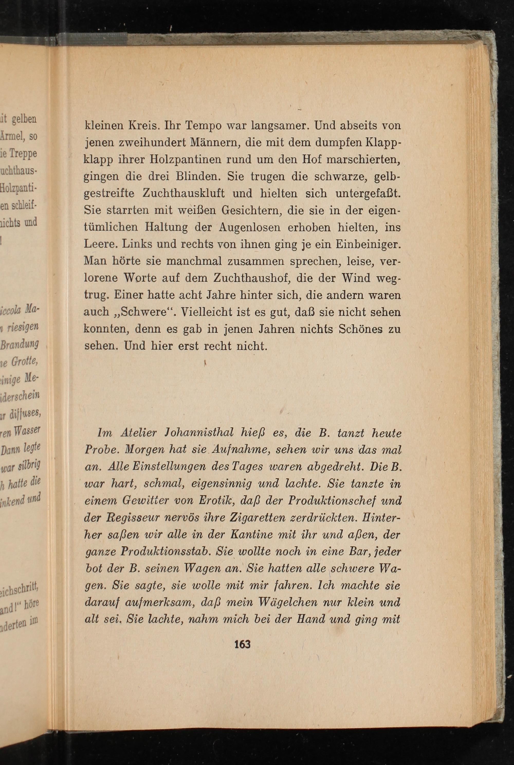 Im Atelier Johannisthal hieß es, die B. tanzt heute Probe. Morgen hat sie Aufnahme, sehen wir uns das mal an. Alle Einstellungen des Tages waren abgedreht. Die B. war hart, schmal, eigensinnig und lachte. Sie tanzte in einem Gewitter von Erotik, daß der Produktionschef und der Regisseur nervös ihre Zigaretten zerdrückten. Hinterher saßen wir alle in der Kantine mit ihr und aẞen, der ganze Produktionsstab. Sie wollte noch in eine Bar, jeder bot der B. seinen Wagen an. Sie hatten alle schwere Wagen. Sie sagte, sie wolle mit mir fahren. Ich machte sie darauf aufmerksam, daß mein Wägelchen nur klein und alt sei. Sie lachte, nahm mich bei der Hand und ging mit