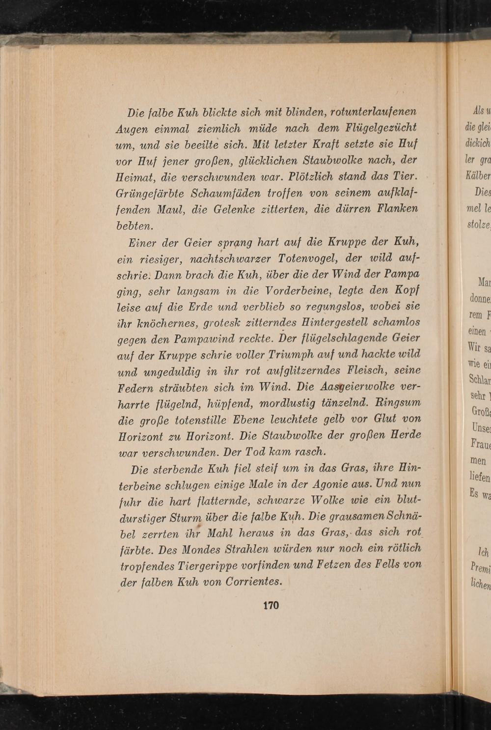 Einer der Geier sprang hart auf die Kruppe der Kuh, ein riesiger, nachtschwarzer Totenvogel, der wild aufschrie. Dann brach die Kuh, über die der Wind der Pampa ging, sehr langsam in die Vorderbeine, legte den Kopf leise auf die Erde und verblieb so regungslos, wobei sie ihr knöchernes, grotesk zitterndes Hintergestell schamlos gegen den Pampawind reckte. Der flügelschlagende Geier auf der Kruppe schrie voller Triumph auf und hackte wild und ungeduldig in ihr rot aufglitzerndes Fleisch, seine Federn sträubten sich im Wind. Die Aasgeierwolke verharrte flügelnd, hüpfend, mordlustig tänzelnd. Ringsum die große totenstille Ebene leuchtete gelb vor Glut von Horizont zu Horizont. Die Staubwolke der großen Herde war verschwunden. Der Tod kam rasch.