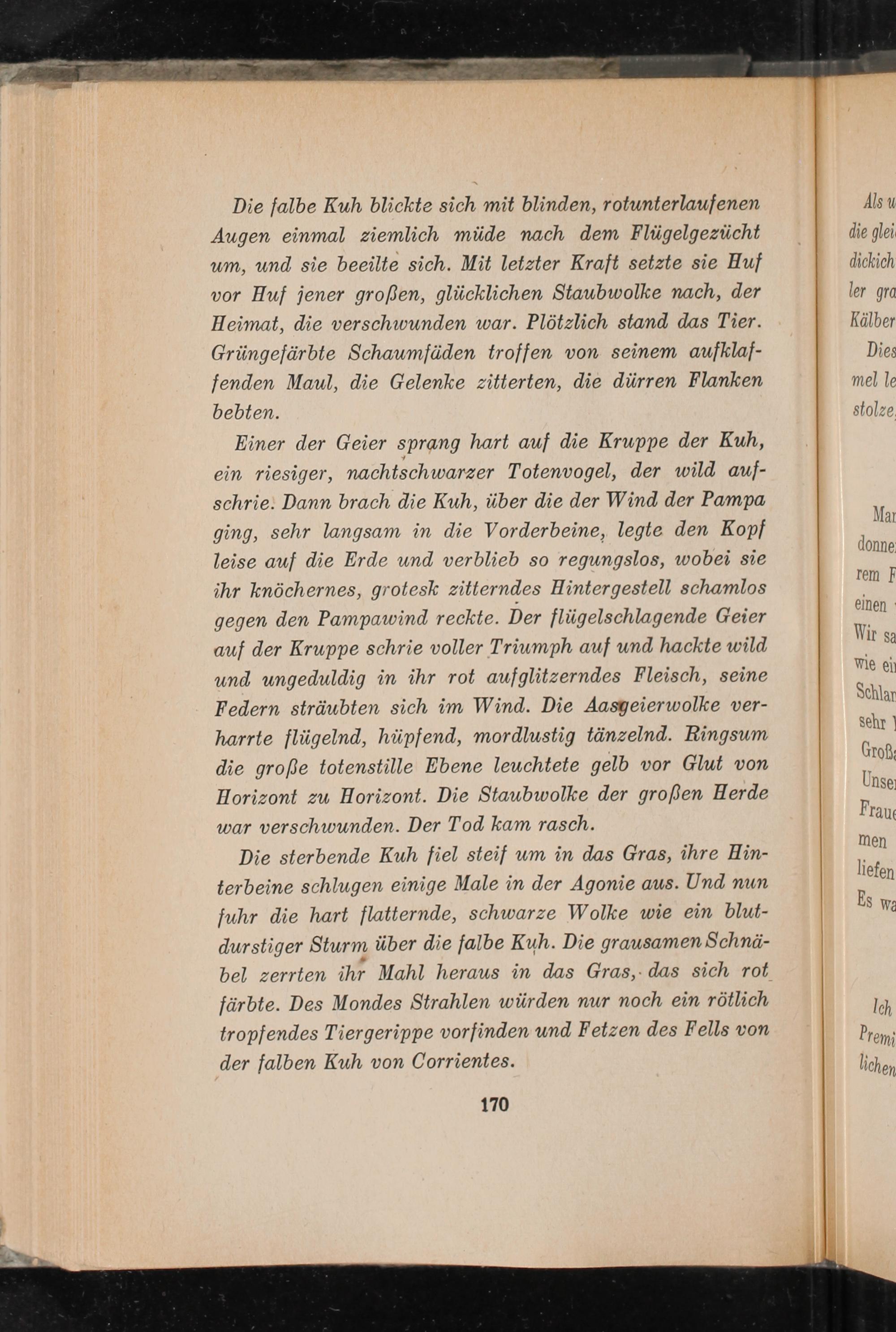 Die sterbende Kuh fiel steif um in das Gras, ihre Hinterbeine schlugen einige Male in der Agonie aus. Und nun fuhr die hart flatternde, schwarze Wolke wie ein blutdurstiger Sturm über die falbe Kuh. Die grausamen Schnäbel zerrten ihr Mahl heraus in das Gras, das sich rot färbte. Des Mondes Strahlen würden nur noch ein rötlich tropfendes Tiergerippe vorfinden und Fetzen des Fells von der falben Kuh von Corrientes .