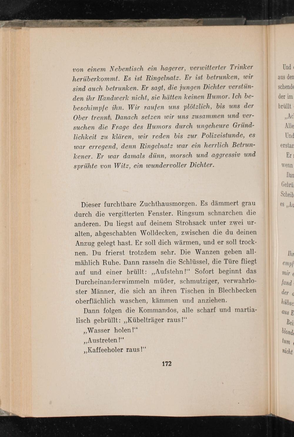 Dieser furchtbare Zuchthausmorgen. Es dämmert grau durch die vergitterten Fenster. Ringsum schnarchen die anderen. Du liegst auf deinem Strohsack unter zwei ur- alten, abgeschabten Wolldecken, zwischen die du deinen Anzug gelegt hast. Er soll dich wärmen, und er soll trock- nen. Du frierst trotzdem sehr. Die Wanzen geben all- mählich Ruhe. Dann rasseln die Schlüssel, die Türe fliegt auf und einer brüllt:„Aufstehn!‘“ Sofort beginnt das Durcheinanderwimmeln müder, schmutziger, verwahrlo- ster Männer, die sich an ihren Tischen in Blechbecken oberflächlich waschen, kämmen und anziehen.