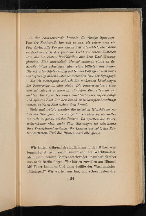 In der Fasanenstraße brannte die riesige Synagoge. Von der Kantstraße her sah es aus, als feiere man ein Fest darin. Alle Fenster waren hell erleuchtet, aber dann verdunkelte sich das festliche Licht zu einem düsteren Rot, als die ersten Rauchballen aus dem Dach herausplatzten. Eine murmelnde Menschenmenge stand in der Straße. Viele schwiegen, aber viele billigten das Feuer. Die rot erleuchteten Haßgesichter der Volksgenossen starrten befriedigt in den düster schwelenden Bau der Synagoge.
