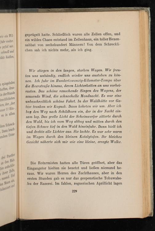 geprügelt hatte. Schließlich waren alle Zellen offen, und ein wildes Chaos entstand im Zellenhaus, ein toller Hexensabbat von sechshundert Männern! Von dem Schrecklichen sah ich nichts mehr, als ich ging.