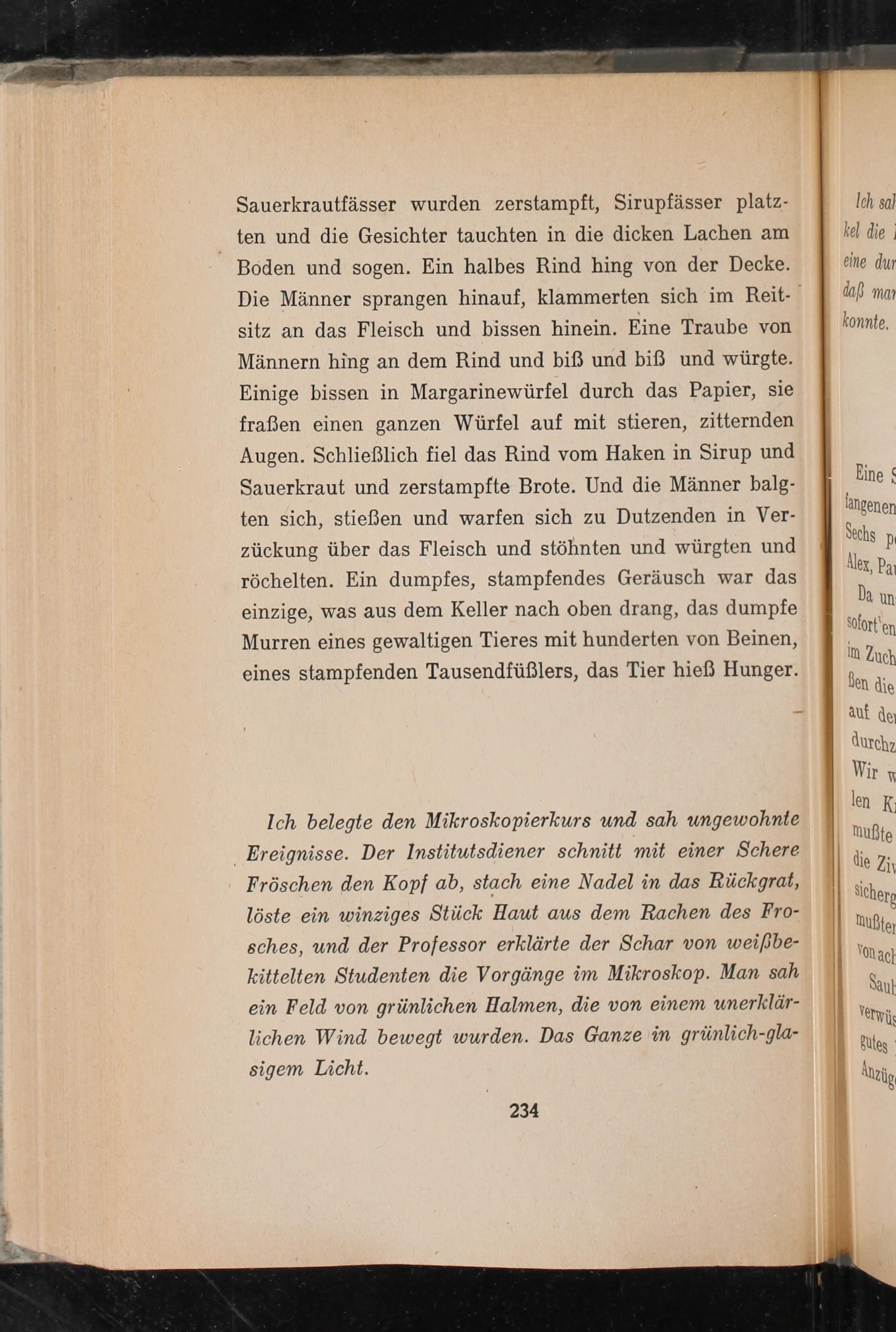 ten und die Gesichter tauchten in die dicken Lachen am«die| _ Boden und sogen. Ein halbes Rind hing von der Decke. eine du Die Männer sprangen hinauf, klammerten sich im Reit- daß mar sitz an das Fleisch und bissen hinein. Eine Traube von konnte, Männern hing an dem Rind und biß und biß und würgte. Einige bissen in Margarinewürfel durch das Papier, sie fraßen einen ganzen Würfel auf mit stieren, zitternden Augen. Schließlich fiel das Rind vom Haken in Sirup und| Sauerkraut und zerstampfte Brote. Und die Männer balg- Bine| ten sich, stießen und warfen sich zu Dutzenden in Ver- Ungenen zückung über das Fleisch und stöhnten und würgten und“ P röchelten. Ein dumpfes, stampfendes Geräusch war das Ba einzige, was aus dem Keller nach oben drang, das dumpfe a Murren eines gewaltigen Tieres mit hunderten von Beinen, n= eines stampfenden Tausendfüßlers, das Tier hieß Hunger. den ii