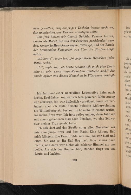 Ich fuhr auf einer überfüllten Lokomotive heim nach Berlin . Drei Jahre lang war ich fern gewesen. Mein Anzug war zerrissen, ich war äußerlich verwildert, innerlich verändert, aber ich lebte. Unsere hübsche Atelierwohnung am Wittenbergplatz bestand nicht mehr. Niemand wußte, wo meine Frau war. Ich irrte ratlos umher, dann fuhr ich mit einem geliehenen Rad nach Potsdam , wo eine Schwester meiner Frau gelebt hatte.