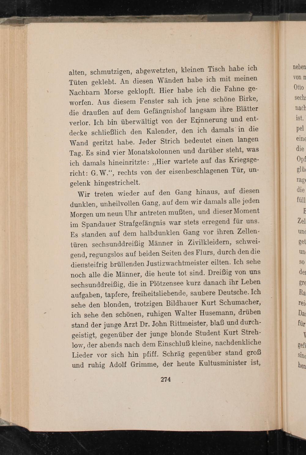 Wir treten wieder auf den Gang hinaus, auf diesen dunklen, unheilvollen Gang, auf dem wir damals alle jeden Morgen um neun Uhr antreten mußten, und dieser Moment im Spandauer Strafgefängnis war stets erregend für uns. Es standen auf dem halbdunklen Gang vor ihren Zellentüren sechsunddreißig Männer in Zivilkleidern, schweigend, regungslos auf beiden Seiten des Flurs, durch den die diensteifrig brüllenden Justizwachtmeister eilten. Ich sehe noch alle die Männer, die heute tot sind. Dreißig von uns sechsunddreißig, die in Plötzensee kurz danach ihr Leben aufgaben, tapfere, freiheitsliebende, saubere Deutsche. Ich sehe den blonden, trotzigen Bildhauer Kurt Schumacher , ich sehe den schönen, ruhigen Walter Husemann , drüben stand der junge Arzt Dr. John Rittmeister, blaß und durchgeistigt, gegenüber der junge blonde Student Kurt Strehlow, der abends nach dem Einschluß kleine, nachdenkliche Lieder vor sich hin pfiff. Schräg gegenüber stand groß und ruhig Adolf Grimme , der heute Kultusminister ist,