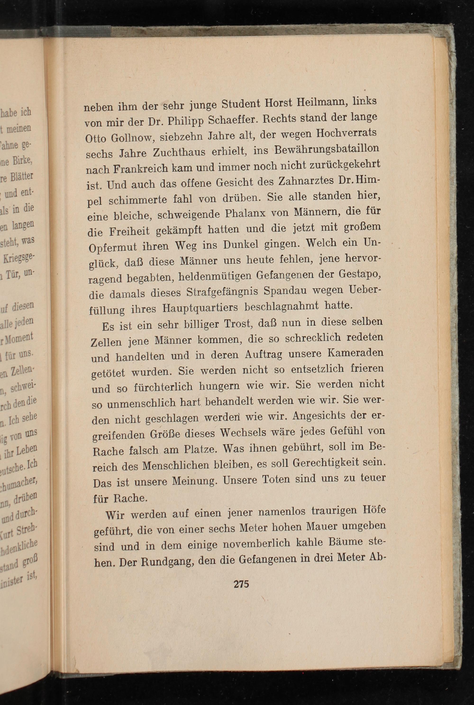 neben ihm der sehr junge Student Horst Heilmann , links von mir der Dr. Philipp Schaeffer. Rechts stand der lange Otto Gollnow, siebzehn Jahre alt, der wegen Hochverrats sechs Jahre Zuchthaus erhielt, ins Bewährungsbataillon nach Frankreich kam und immer noch nicht zurückgekehrt ist. Und auch das offene Gesicht des Zahnarztes Dr. Himpel schimmerte fahl von drüben. Sie alle standen hier, eine bleiche, schweigende Phalanx von Männern, die für die Freiheit gekämpft hatten und die jetzt mit großem Opfermut ihren Weg ins Dunkel gingen. Welch ein Unglück, daß diese Männer uns heute fehlen, jene hervorragend begabten, heldenmütigen Gefangenen der Gestapo , die damals dieses Strafgefängnis Spandau wegen Ueberfüllung ihres Hauptquartiers beschlagnahmt hatte.