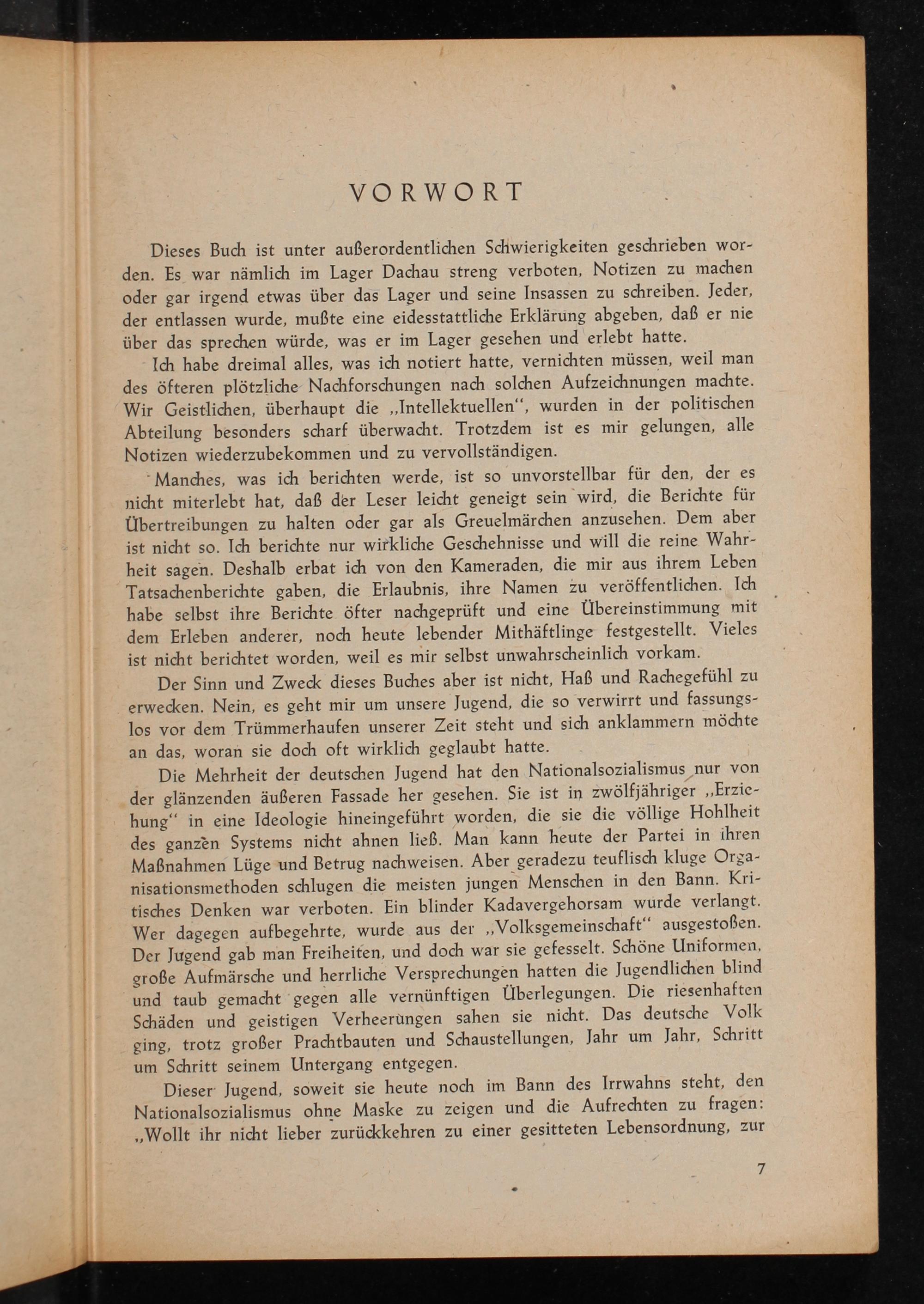 Dieses Buch ist unter außerordentlichen Schwierigkeiten geschrieben worden. Es war nämlich im Lager Dachau streng verboten, Notizen zu machen oder gar irgend etwas über das Lager und seine Insassen zu schreiben. Jeder, der entlassen wurde, mußte eine eidesstattliche Erklärung abgeben, daß er nie über das sprechen würde, was er im Lager gesehen und erlebt hatte.