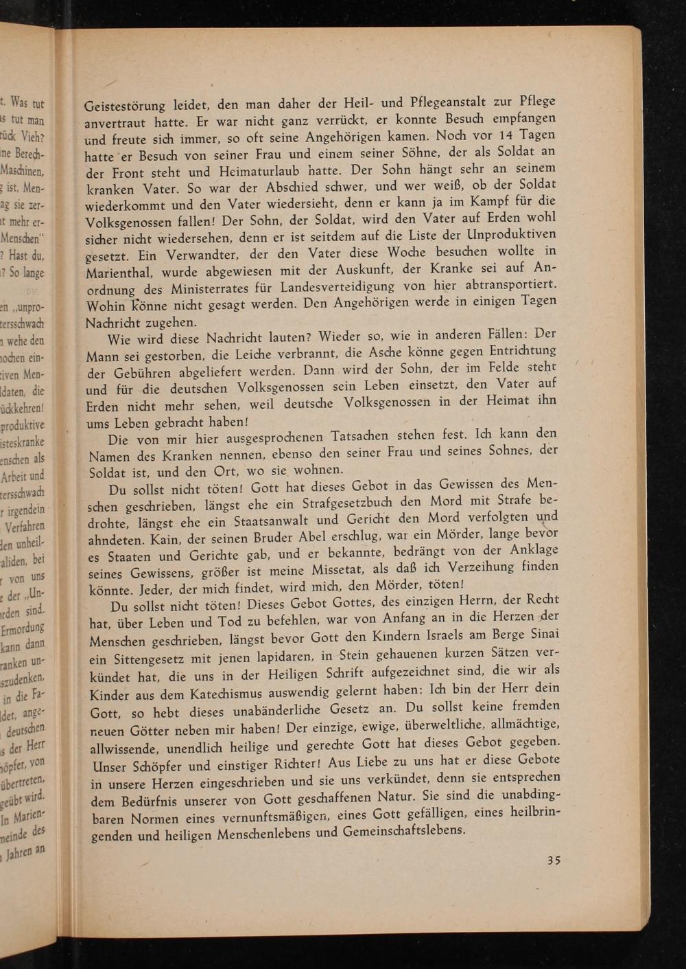 Geistestörung leidet, den man daher der Heil- und Pflegeanstalt zur Pflege anvertraut hatte. Er war nicht ganz verrückt, er konnte Besuch empfangen und freute sich immer, so oft seine Angehörigen kamen. Noch vor 14 Tagen hatte er Besuch von seiner Frau und einem seiner Söhne, der als Soldat an der Front steht und Heimaturlaub hatte. Der Sohn hängt sehr an seinem kranken Vater. So war der Abschied schwer, und wer weiß, ob der Soldat wiederkommt und den Vater wiedersieht, denn er kann ja im Kampf für die Volksgenossen fallen! Der Sohn, der Soldat, wird den Vater auf Erden wohl sicher nicht wiedersehen, denn er ist seitdem auf die Liste der Unproduktiven gesetzt. Ein Verwandter, der den Vater diese Woche besuchen wollte in Marienthal, wurde abgewiesen mit der Auskunft, der Kranke sei auf Anordnung des Ministerrates für Landesverteidigung von hier abtransportiert. Wohin könne nicht gesagt werden. Den Angehörigen werde in einigen Tagen Nachricht zugehen.